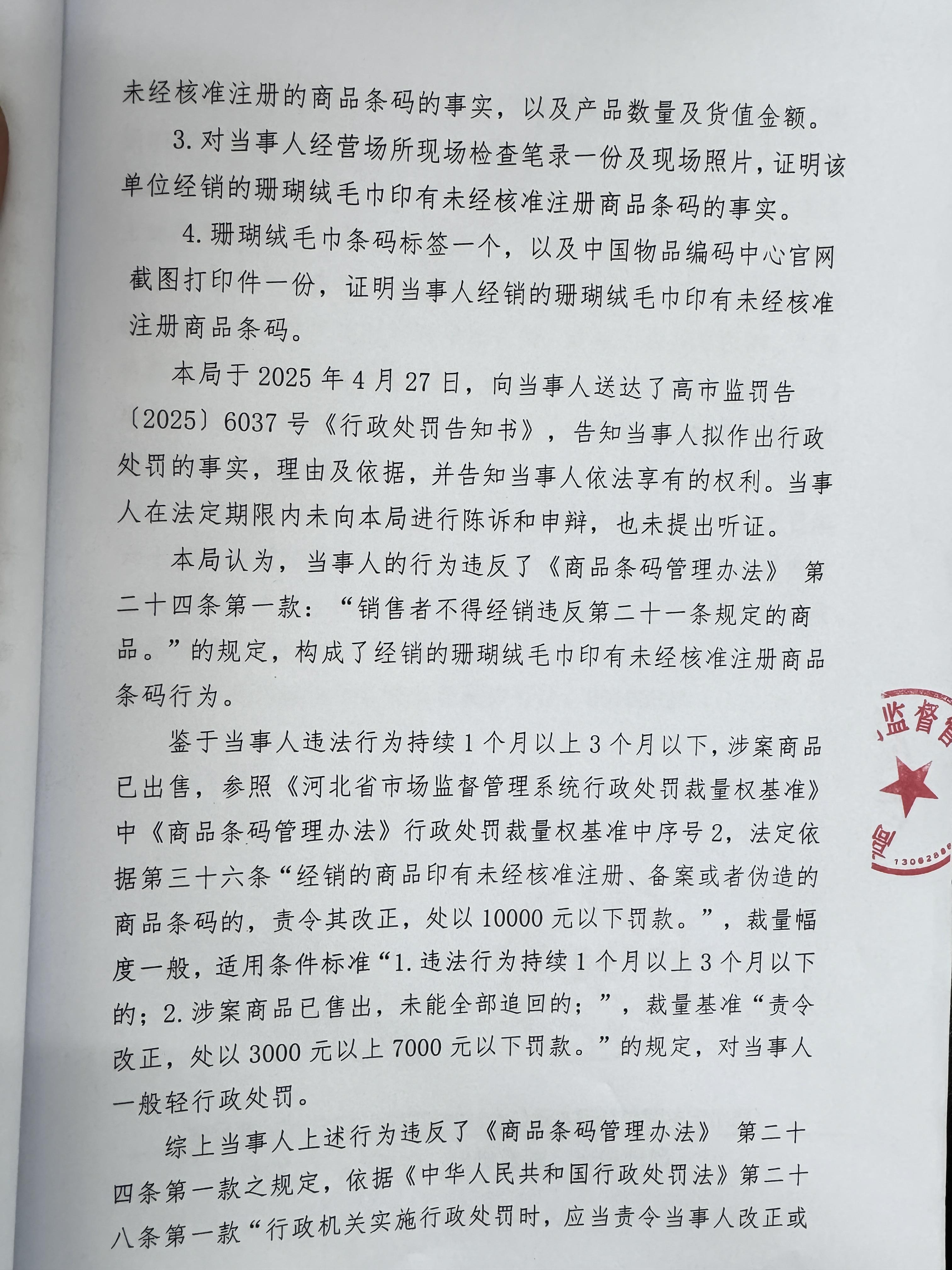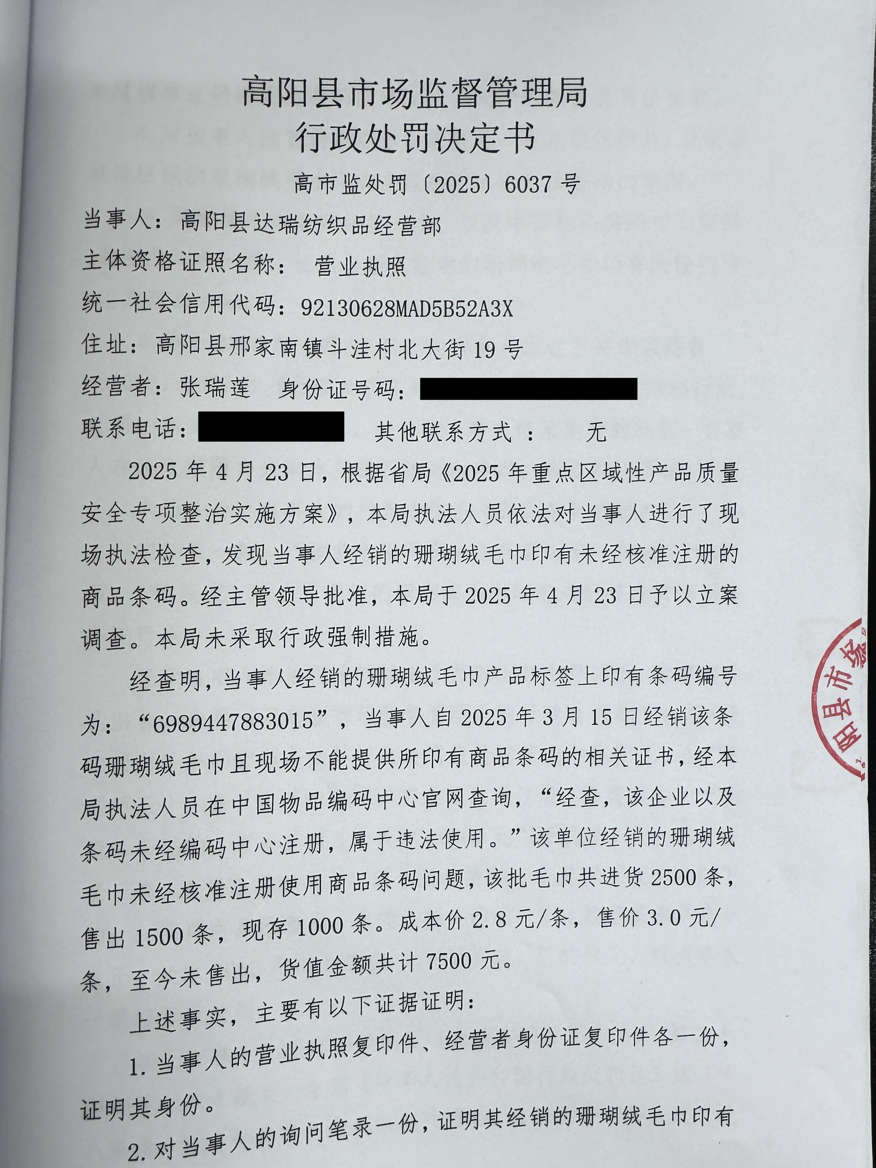 高阳县达瑞纺织品经营部经销的珊瑚绒毛巾印有未经核准注册的商品条码