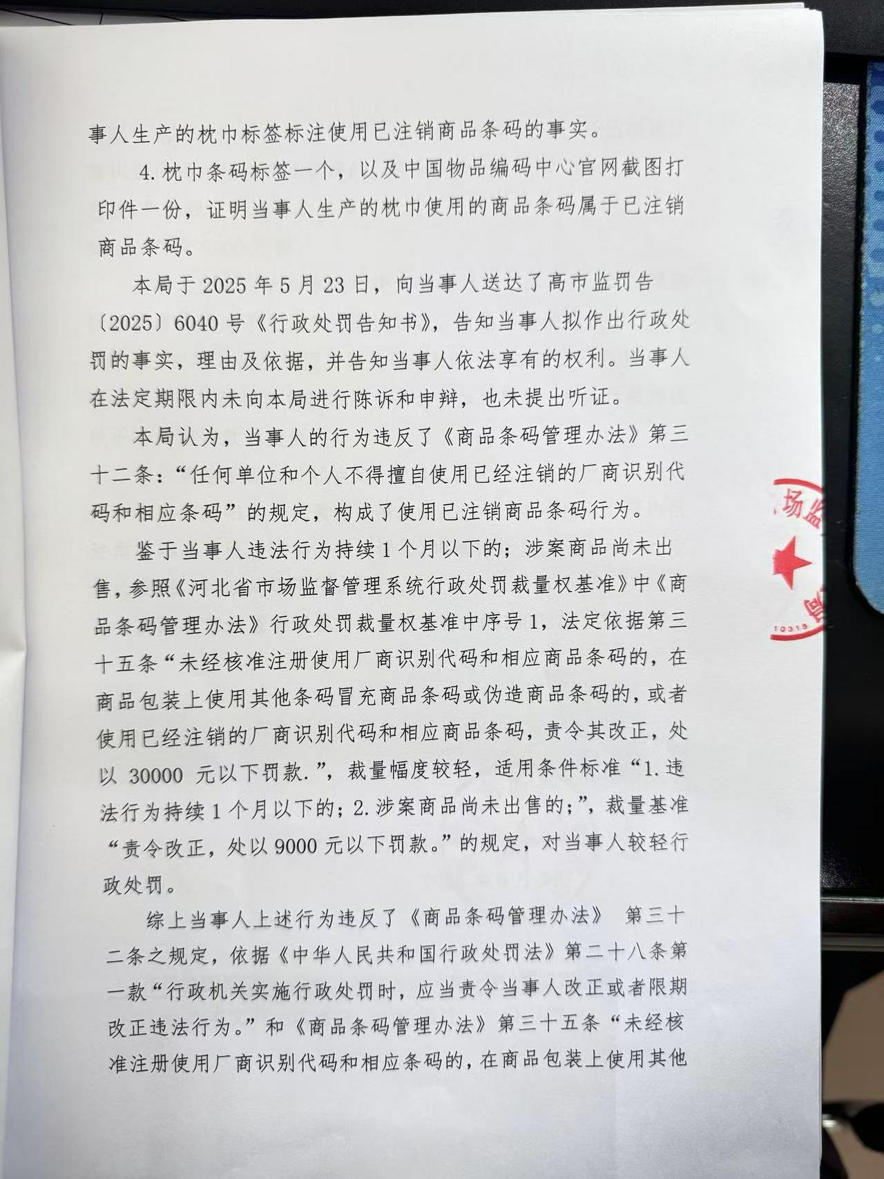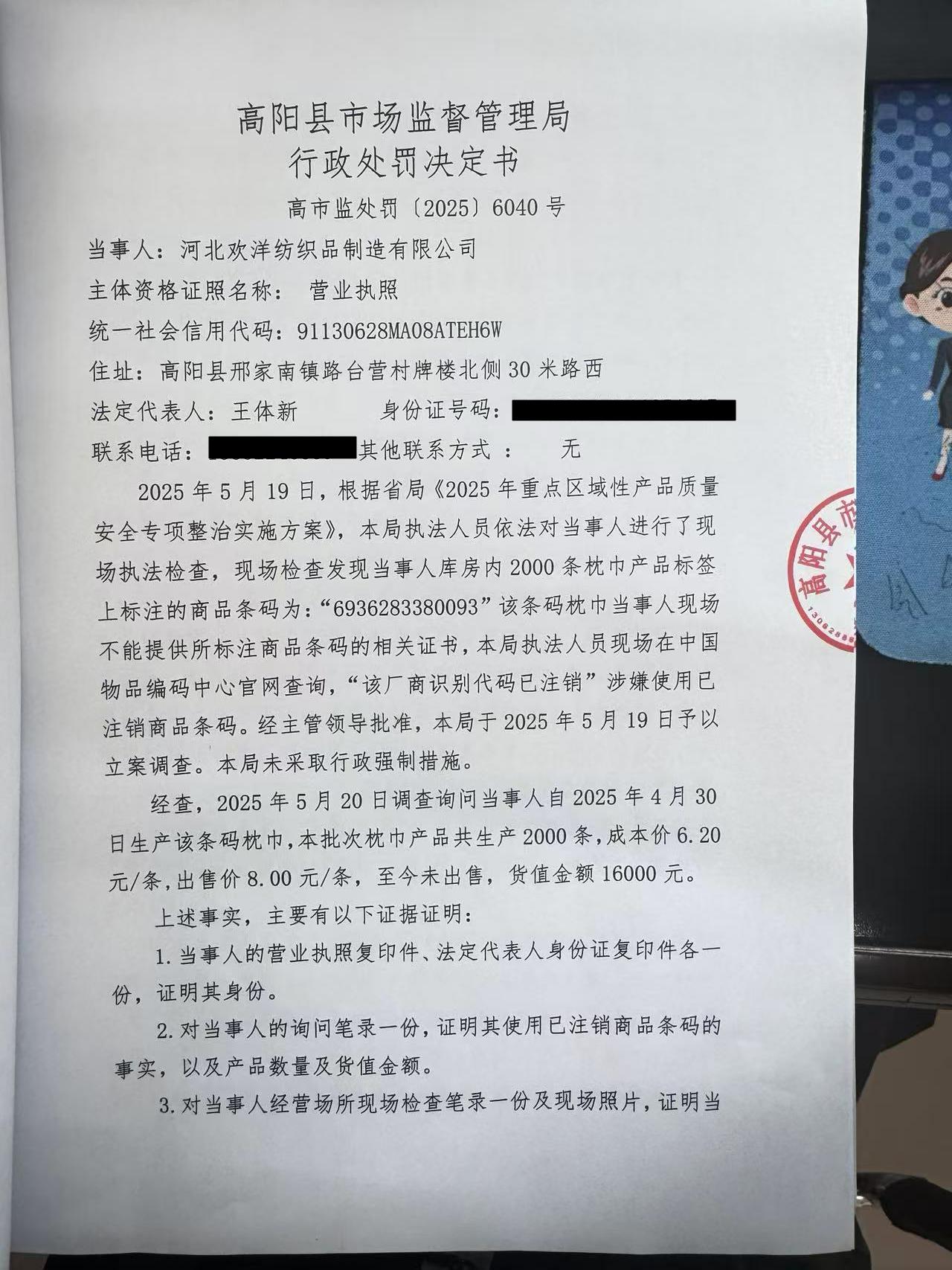 河北欢洋纺织品制造有限公司生产的枕巾在商品包装上使用已经注销的商品条码