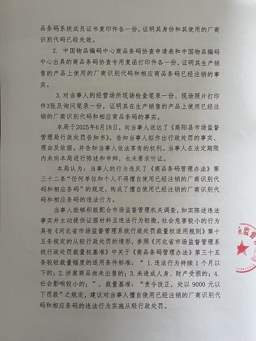 高阳县旭蕾珊瑚绒毯厂擅自使用已经注销的 厂商识别代码和相应商品条码案