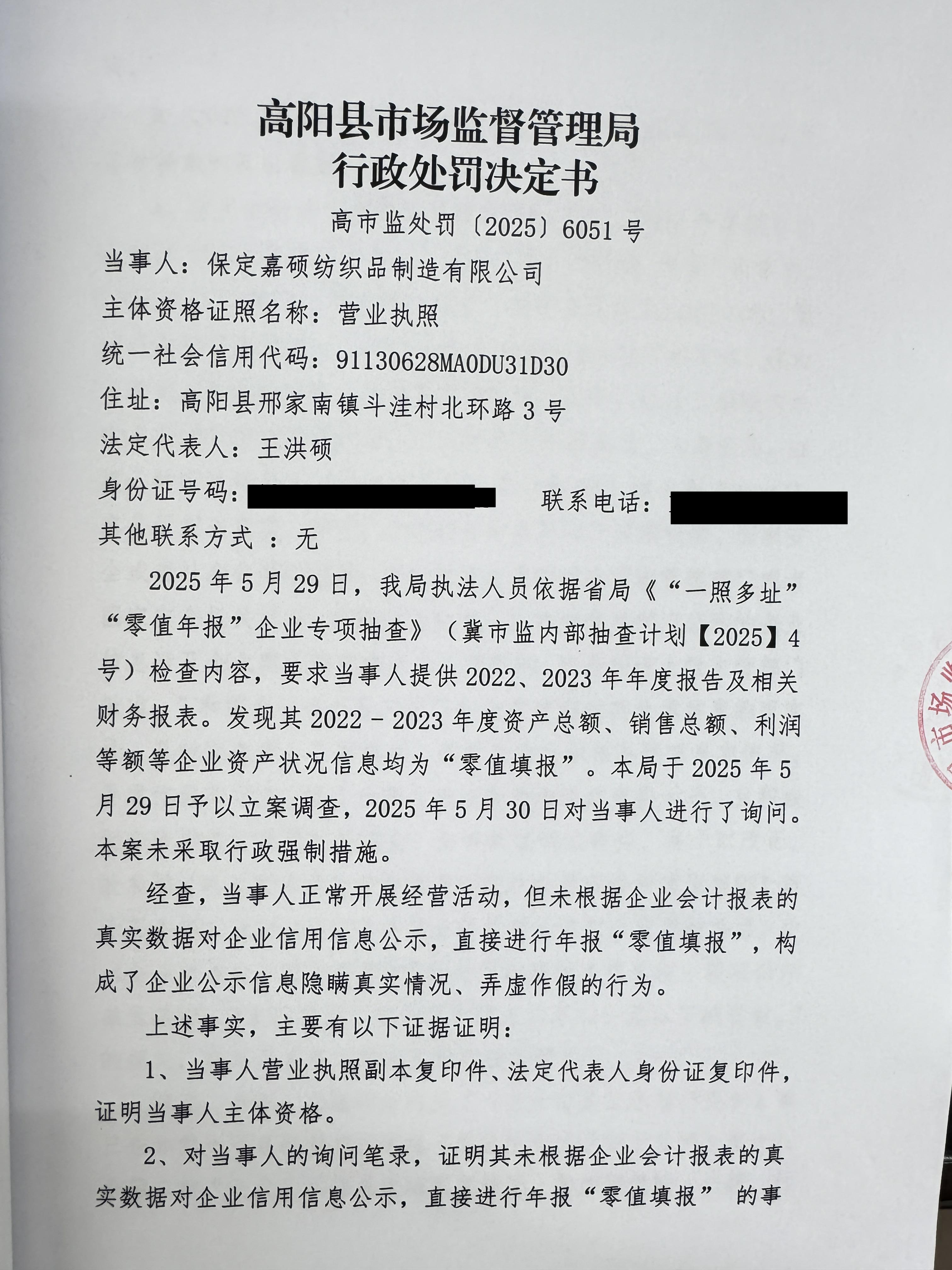 保定嘉硕纺织品制造有限公司企业公示信息隐瞒真实情况、弄虚作假