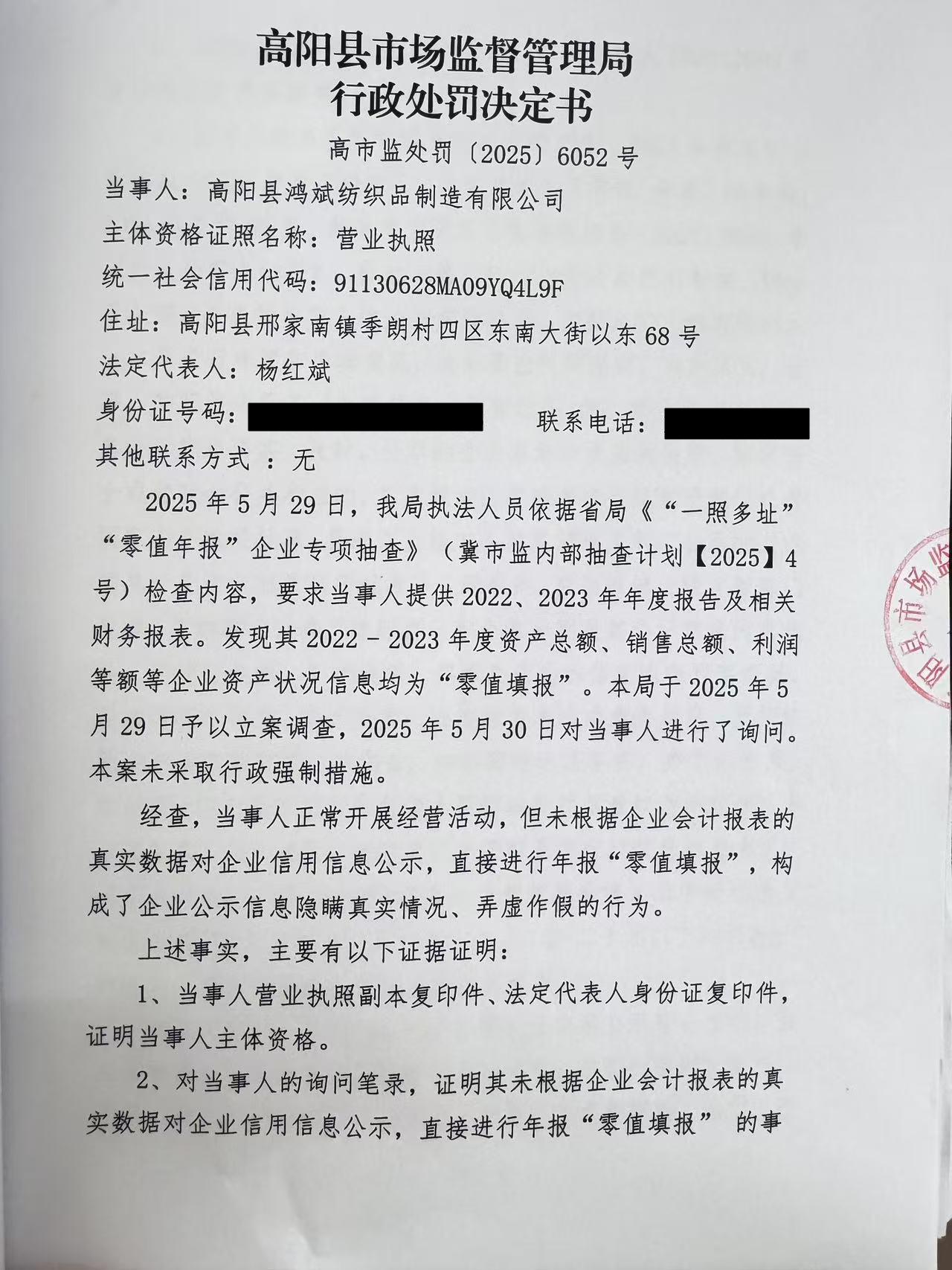 高阳县鸿斌纺织品制造有限公司企业公示信息隐瞒真实情况、弄虚作假案