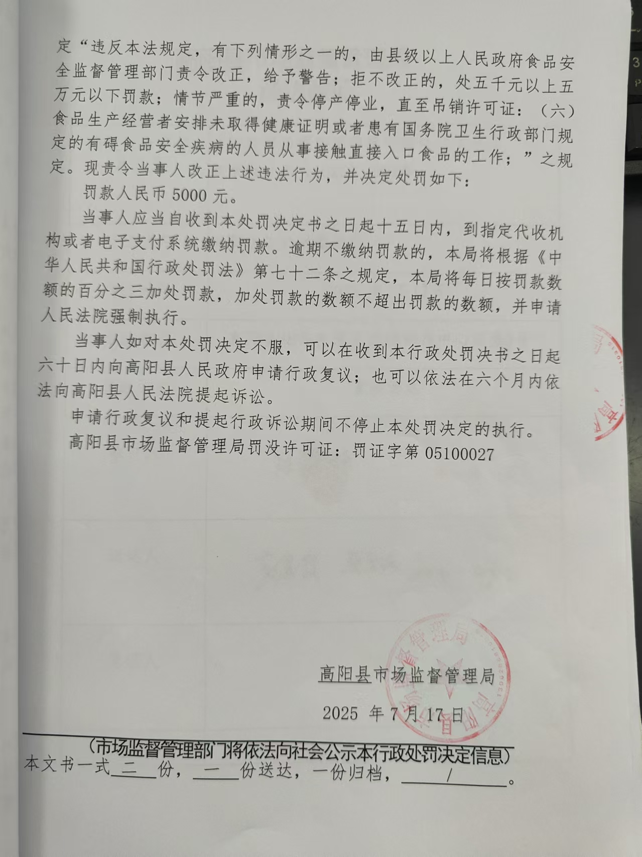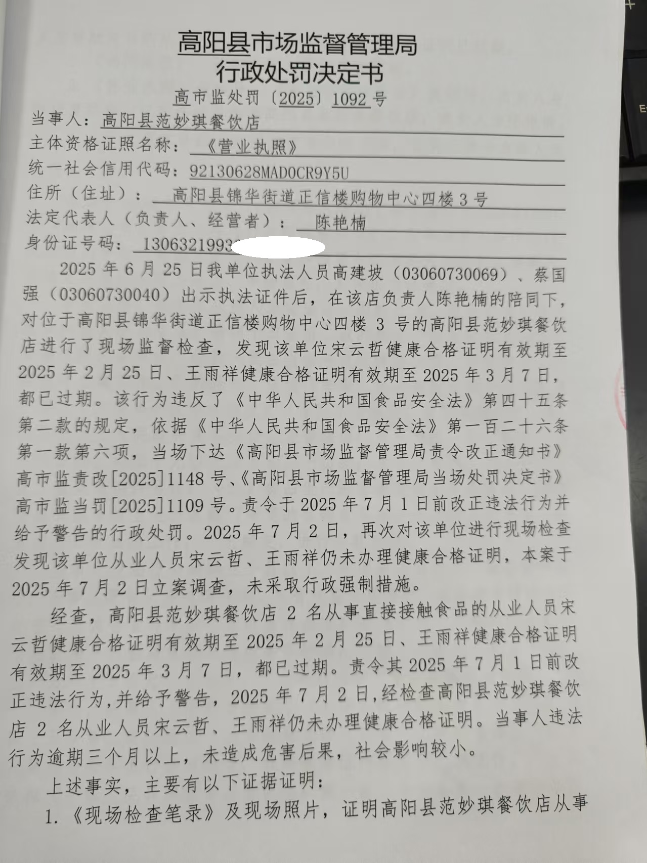 高阳县范妙琪餐饮店从业人员健康证过期案