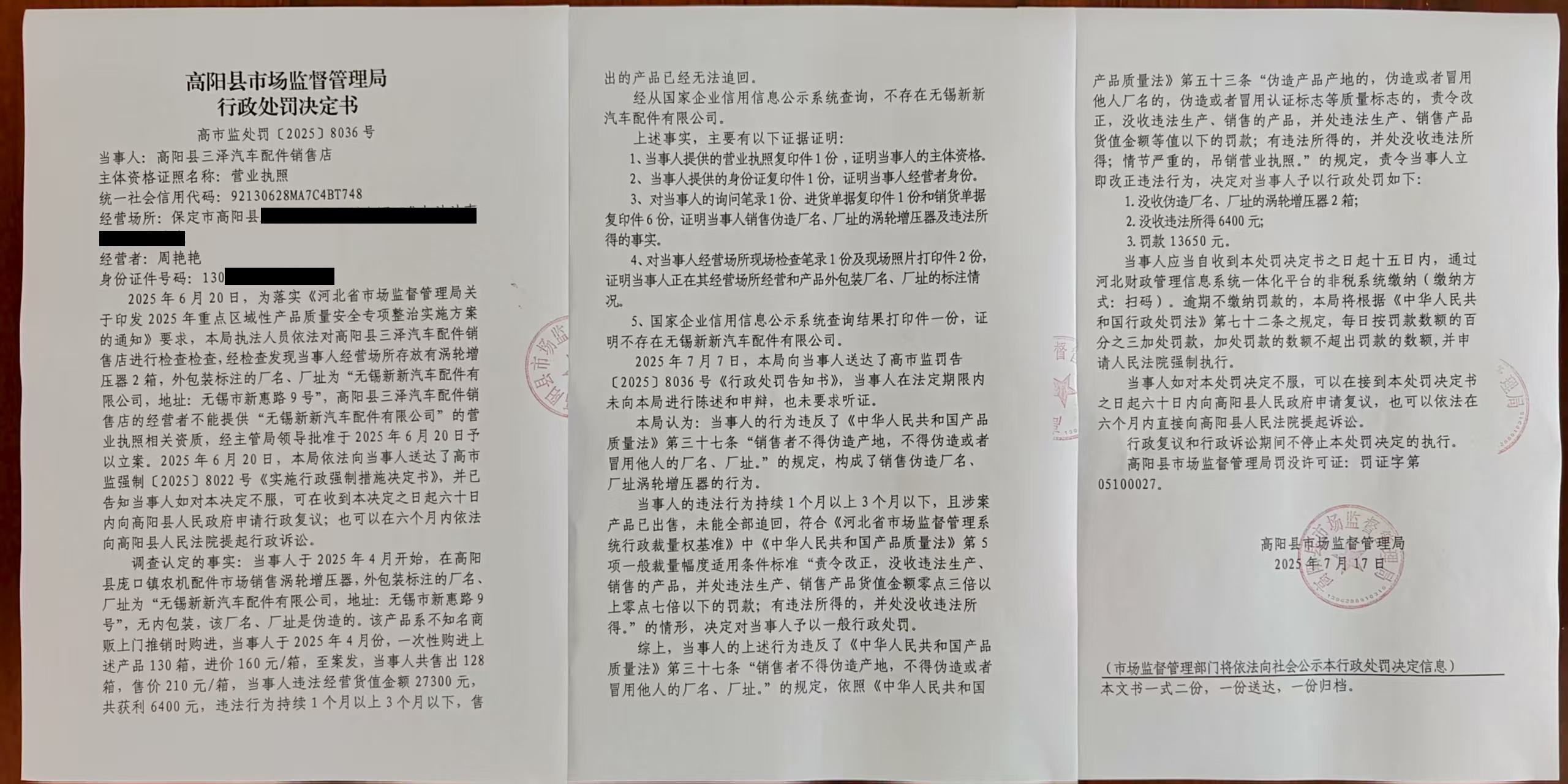 高阳县三泽汽车配件销售店销售伪造厂名、厂址的涡轮增压器案