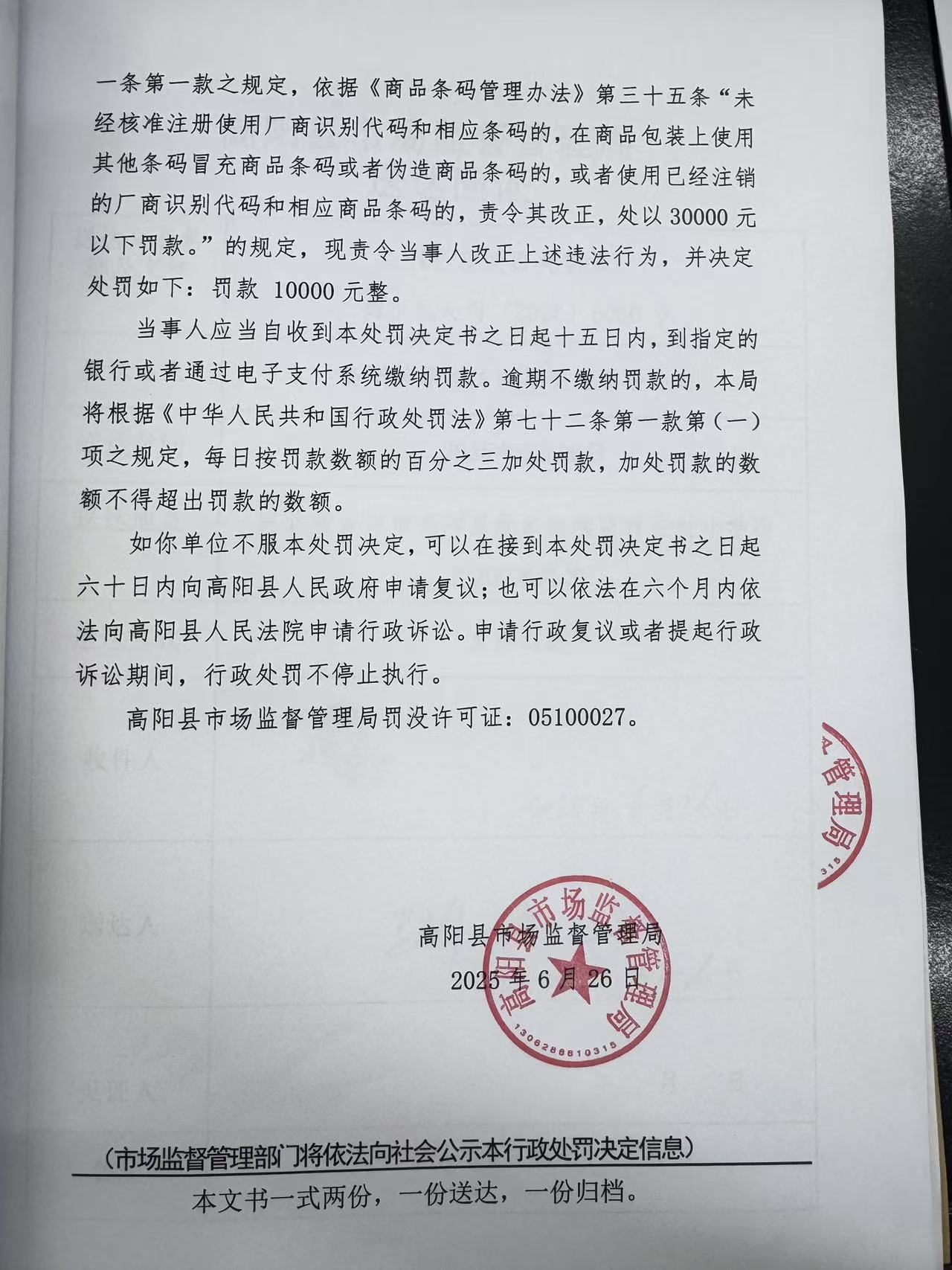 高阳县厚润纺织品制造有限公司生产的毛巾未经核准注册使用商品条码