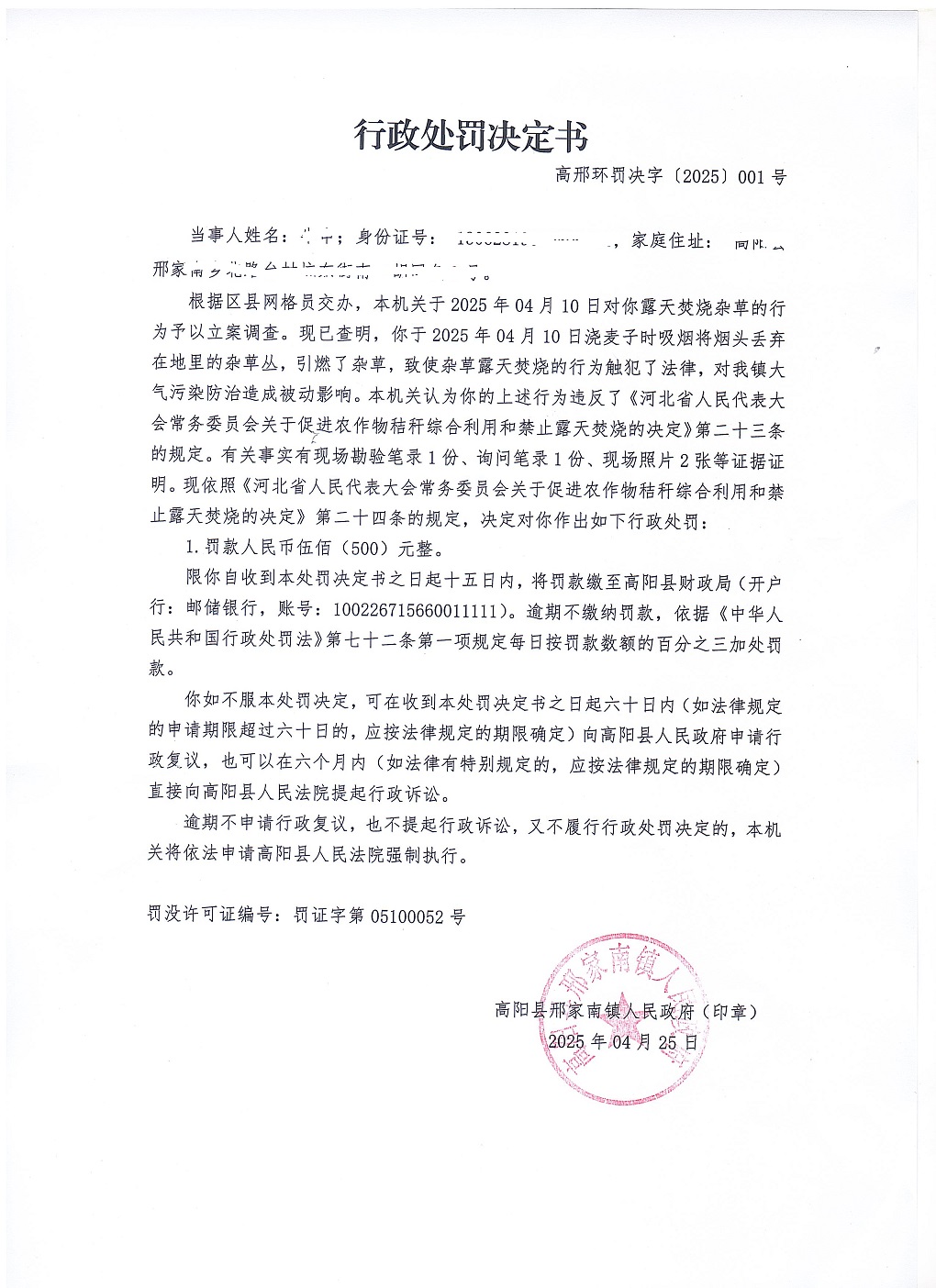 高阳县邢家南镇人民政府于2025年4月25日依法向牛申送达《行政处罚决定书》高邢环罚决字〔2025〕001号。