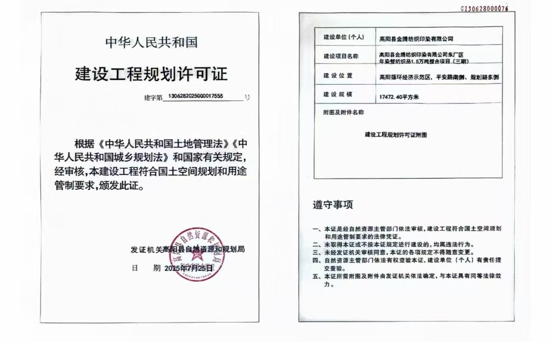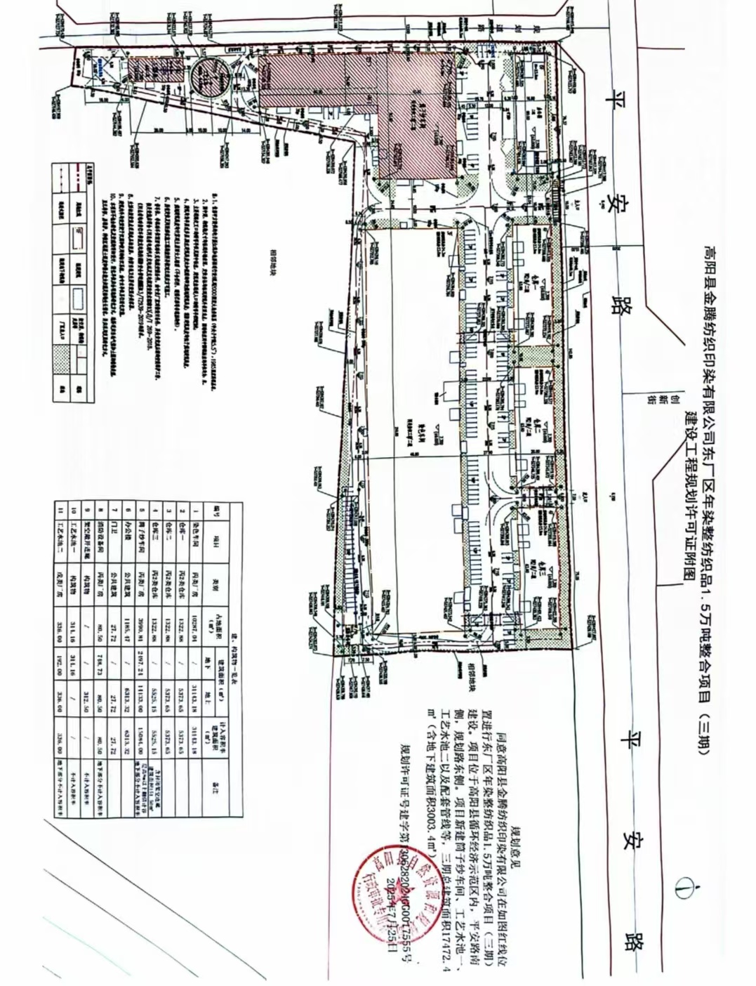 高阳县金腾纺织印染有限公司东厂区年染整纺织品1.5万吨整合项目(三期)建设工程规划许可证