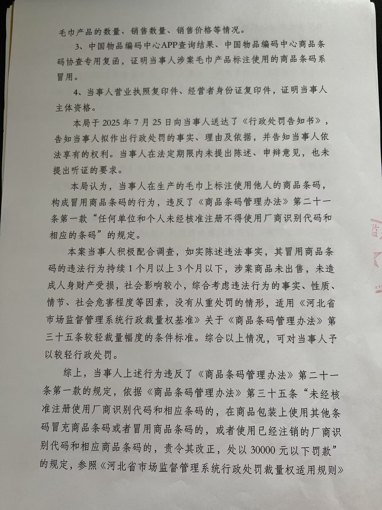 高阳县奥达纺织品厂生产的毛巾冒用商品条码案