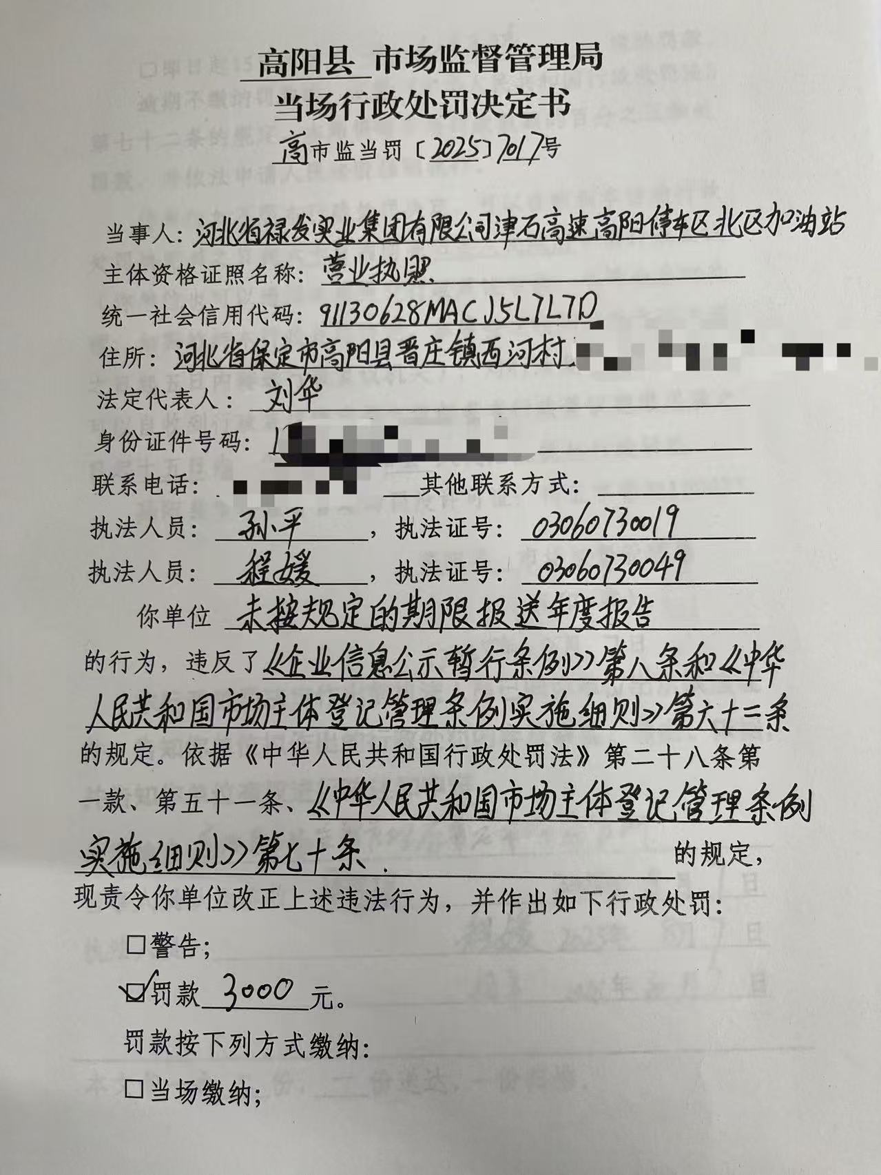 河北省禄发实业集团有限公司津石高速高阳停车区北区加油站未按规定的期限报送年度报告案