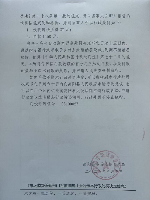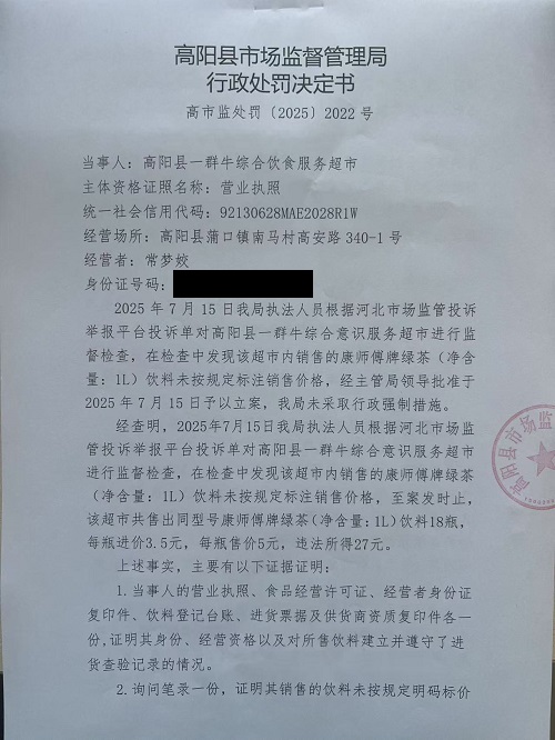 高阳县一群牛综合饮食服务超市销售的饮料未按规定明码标价案
