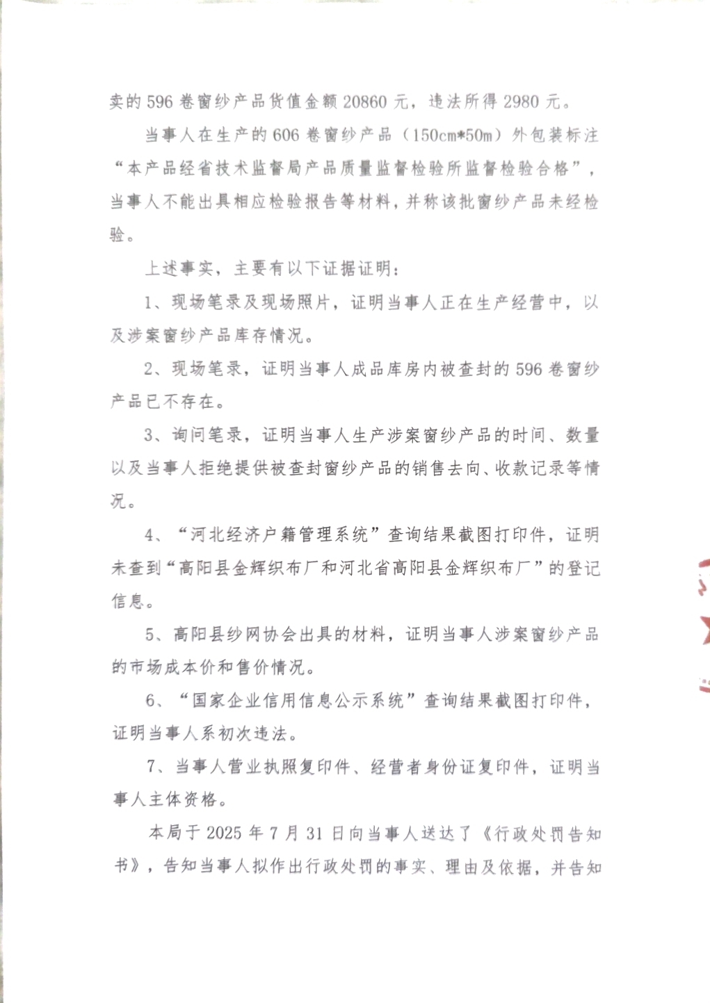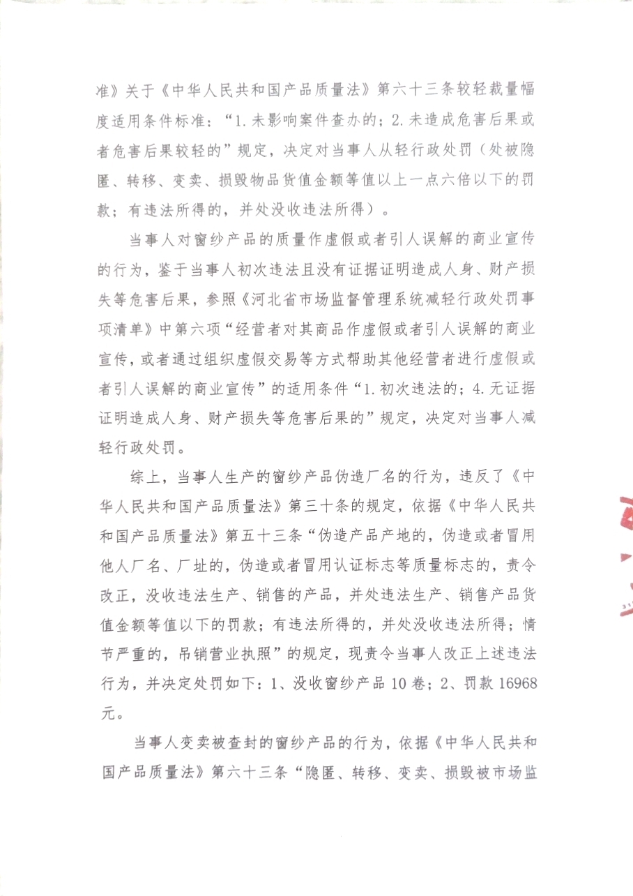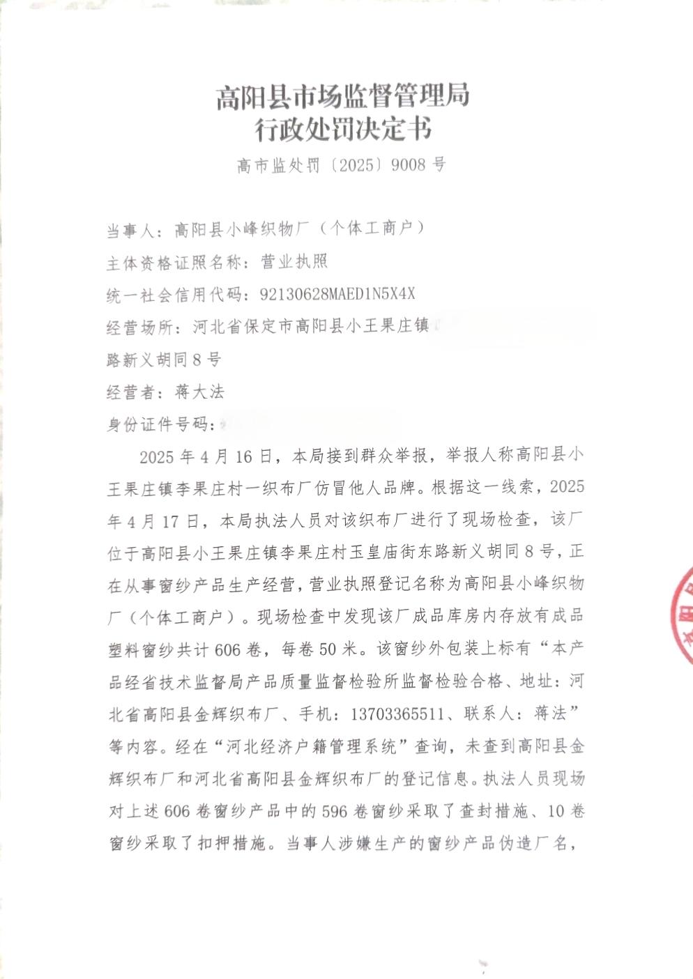 高阳县小峰织物厂(个体工商户) 生产的窗纱产品伪造厂名和对窗纱产品的质量 作虚假或者引人误解的商业宣传案