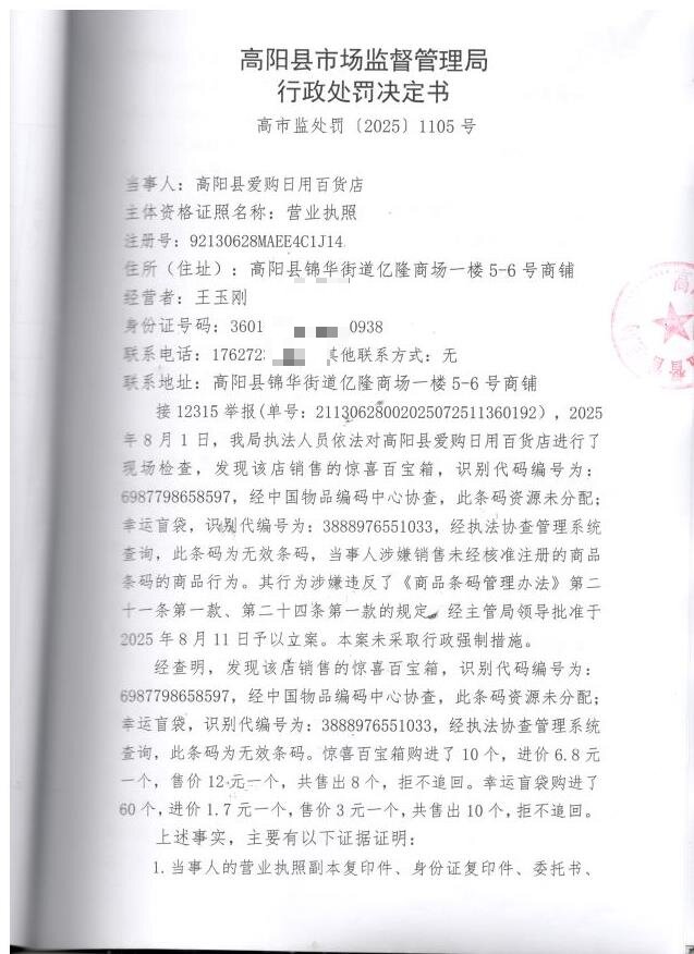 高阳县爱购日用百货店销售未经核准注册的商品条码的商品案