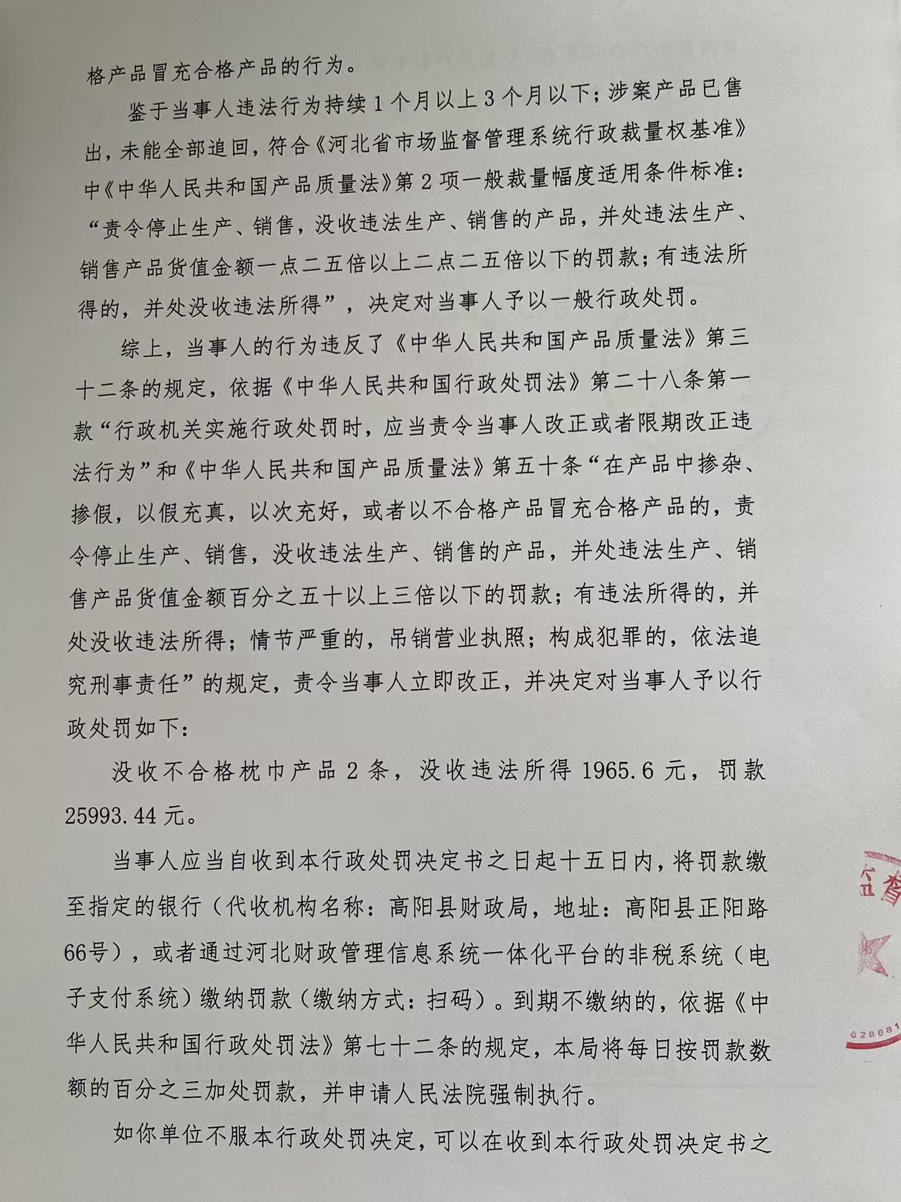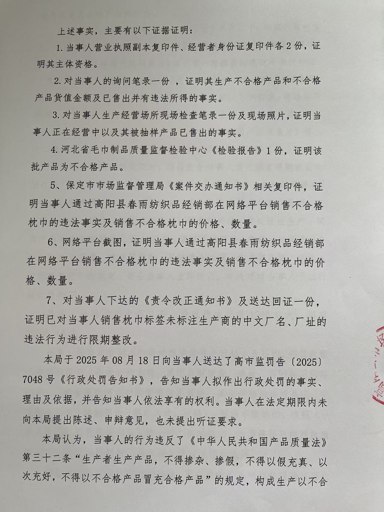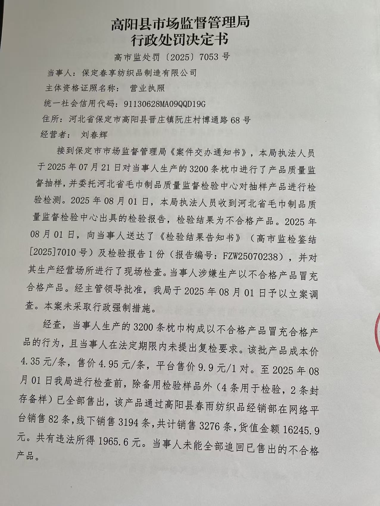 保定春享纺织品制造有限公司生产以不合格产品冒充合格产品案