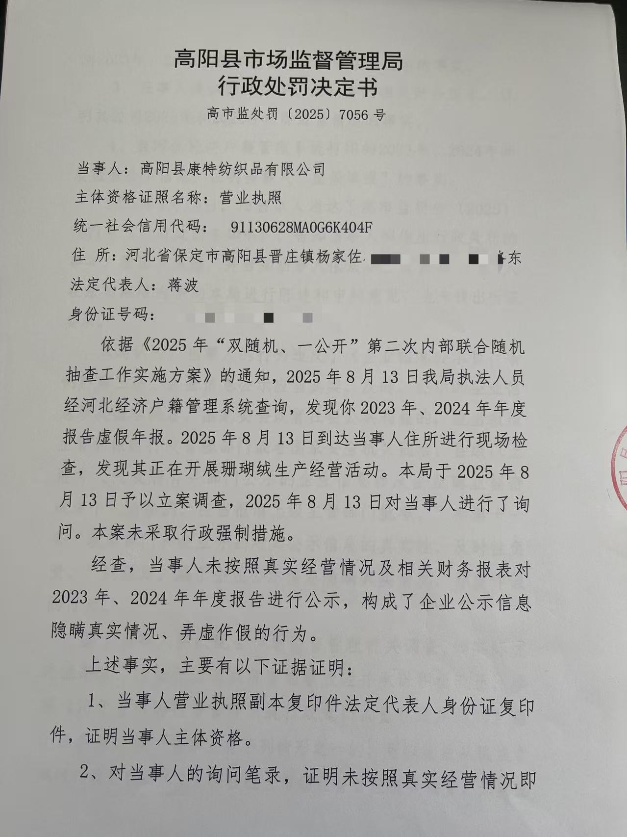 高阳县康特纺织品有限公司企业公示信息隐瞒真实情况、弄虚作假案