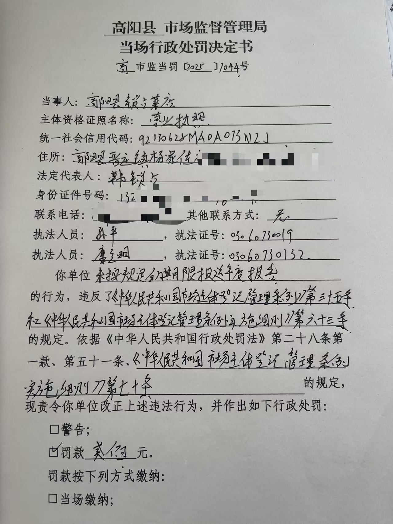 高阳县锁占菜店未按规定的期限报送年度报告案