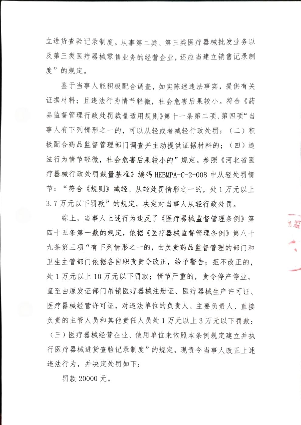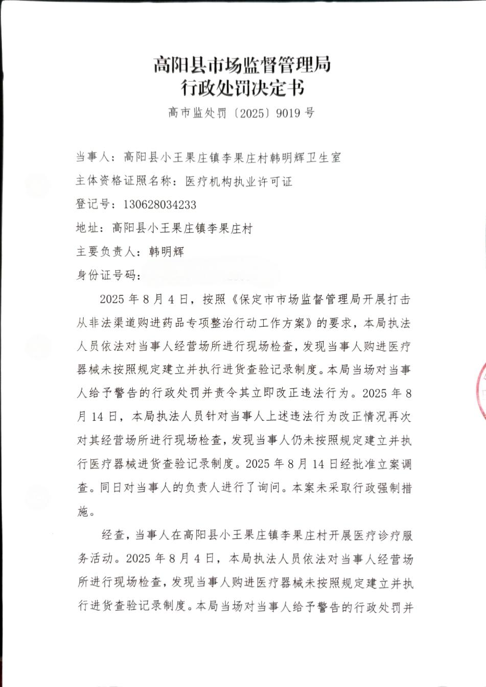 高阳县小王果庄镇李果庄村韩明辉卫生室未按照规定建立并执行医疗器械进货查验记录制度案