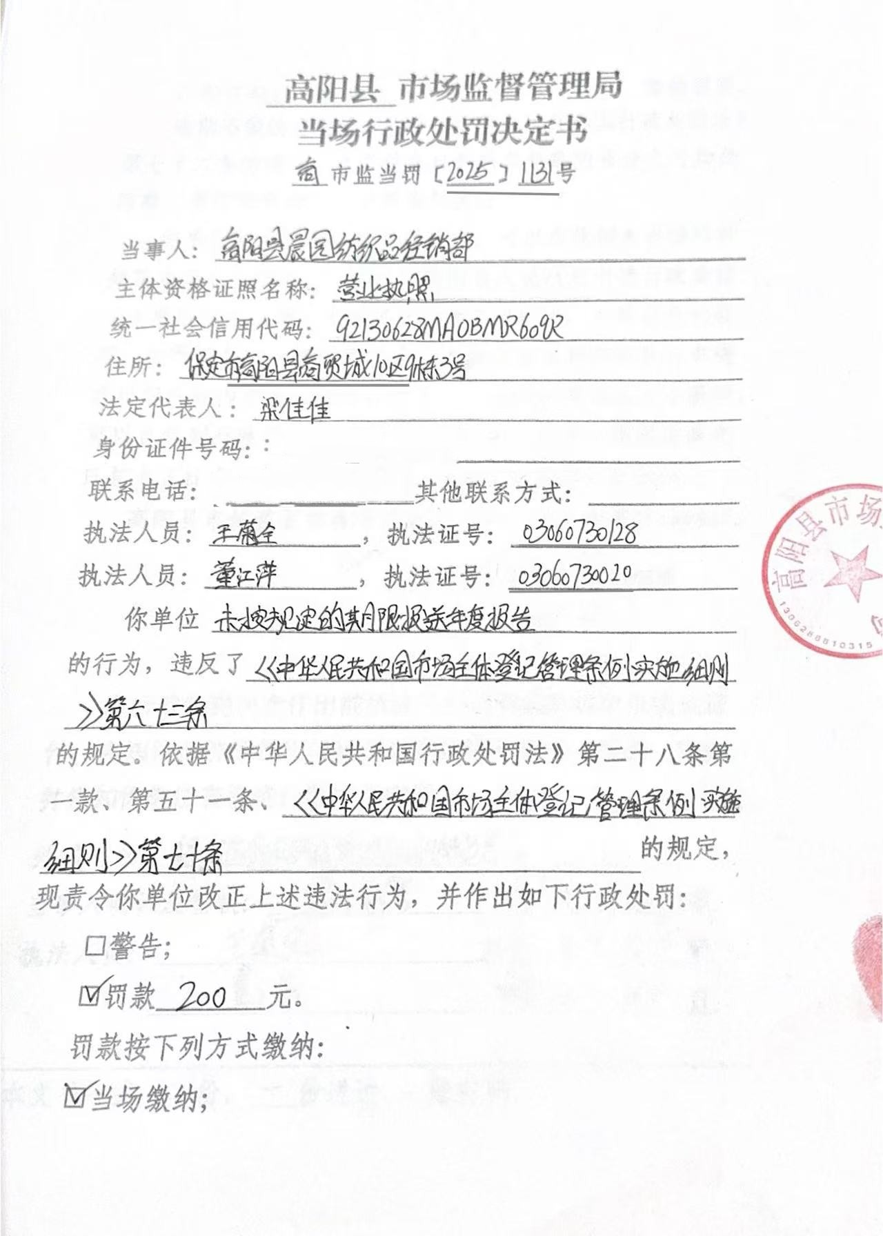 高阳县晨园纺织品经销部未按规定的期限报送年度报告案