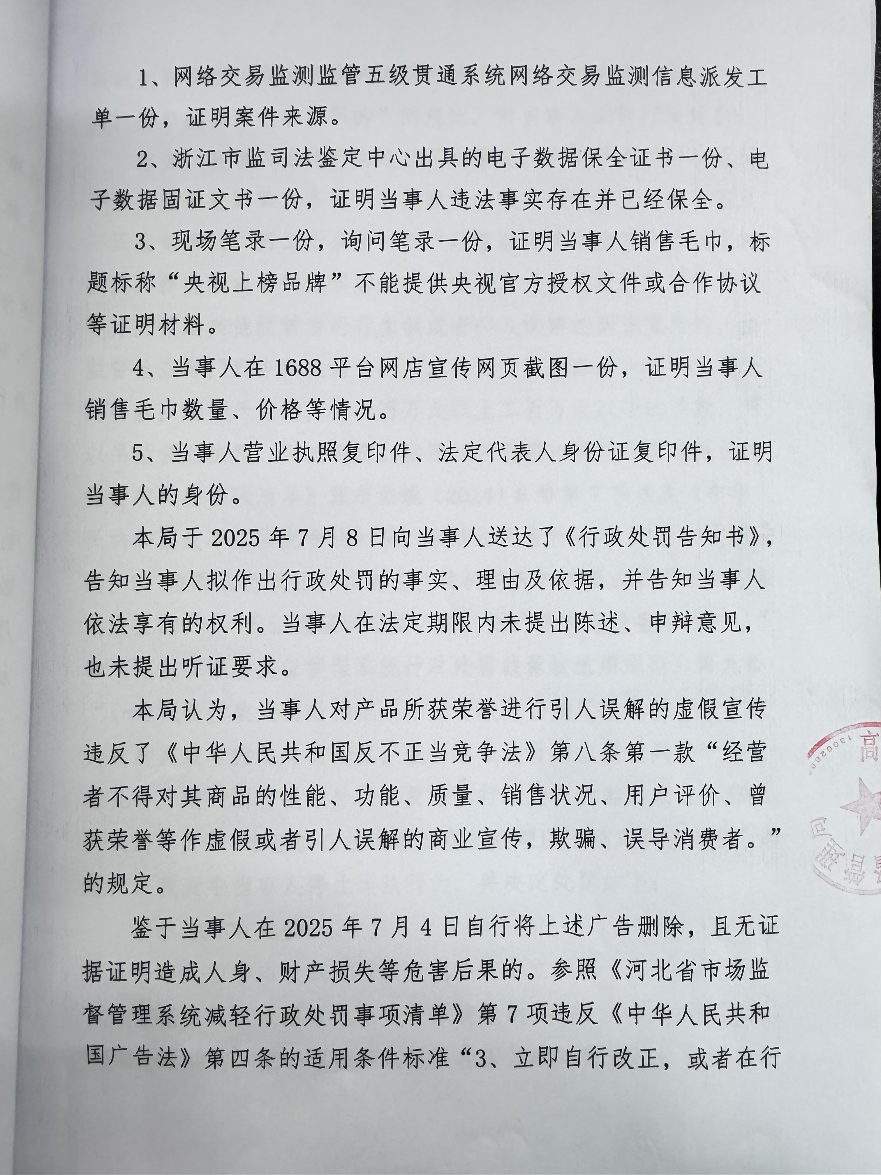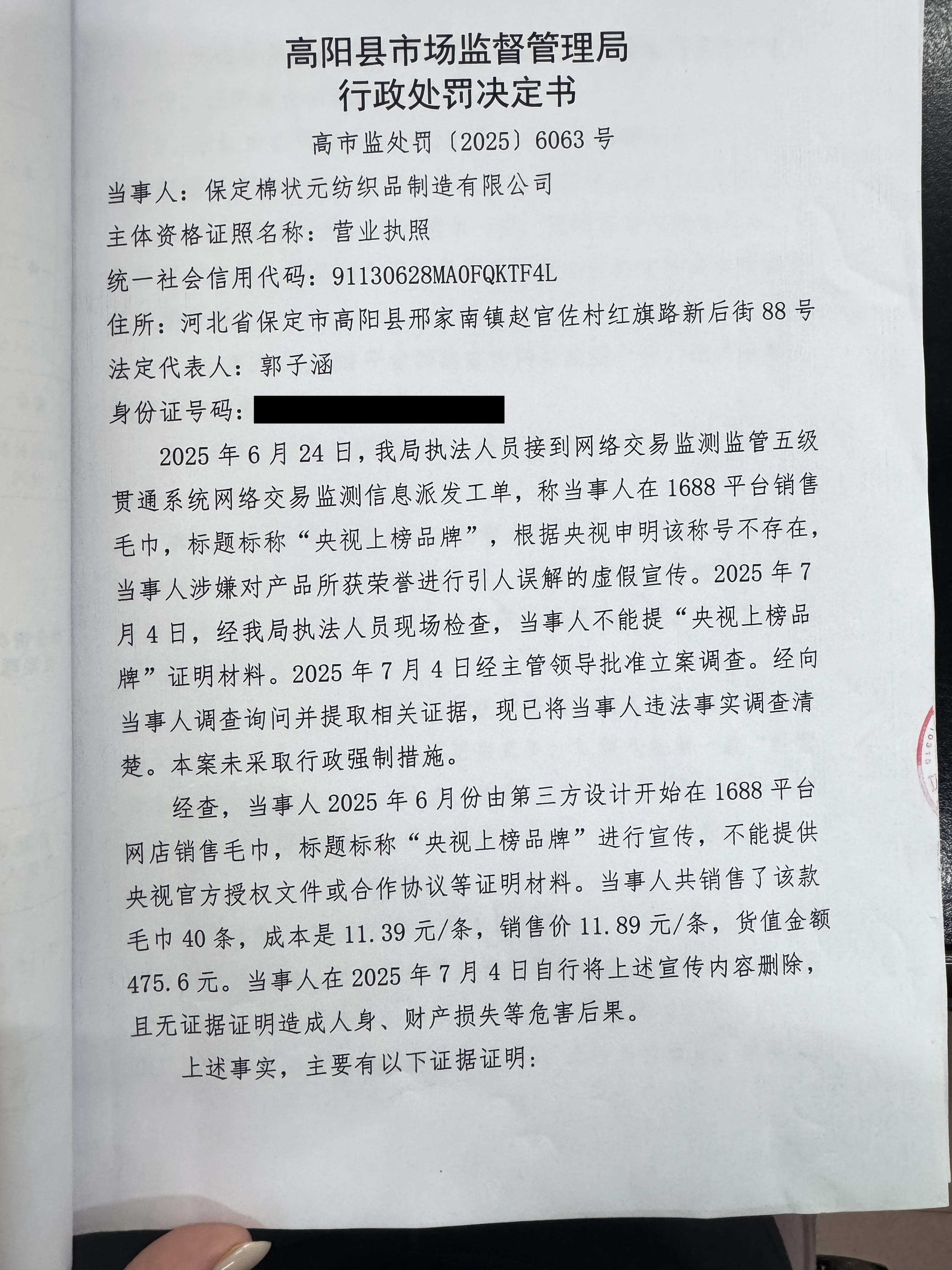 保定棉状元纺织品制造有限公司对产品所获荣誉进行引人误解的商业宣传