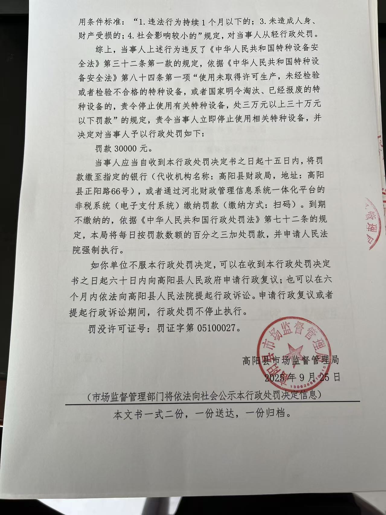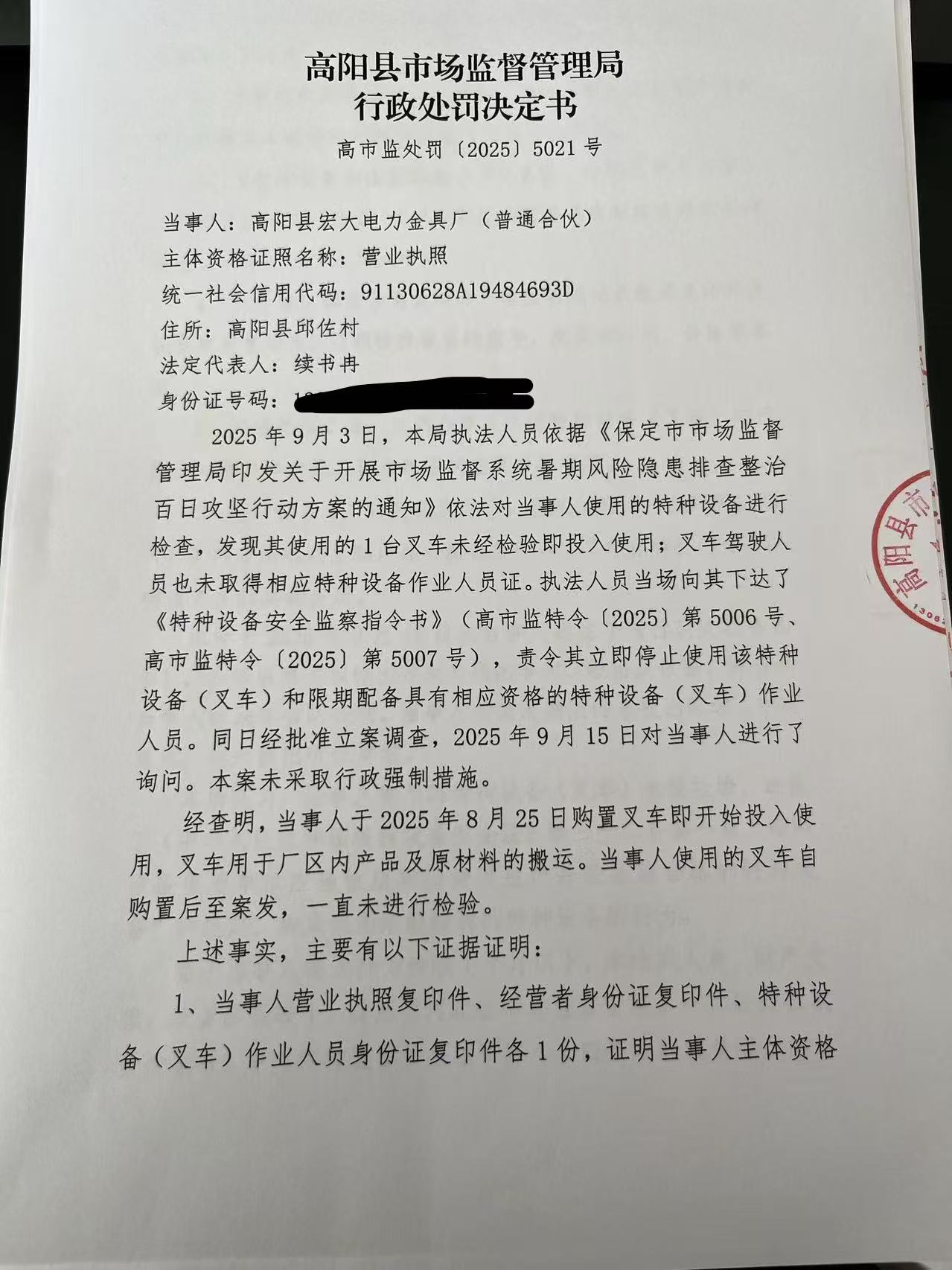 高阳县宏大电力金具厂(普通合伙)使用未经检验的特种设备案