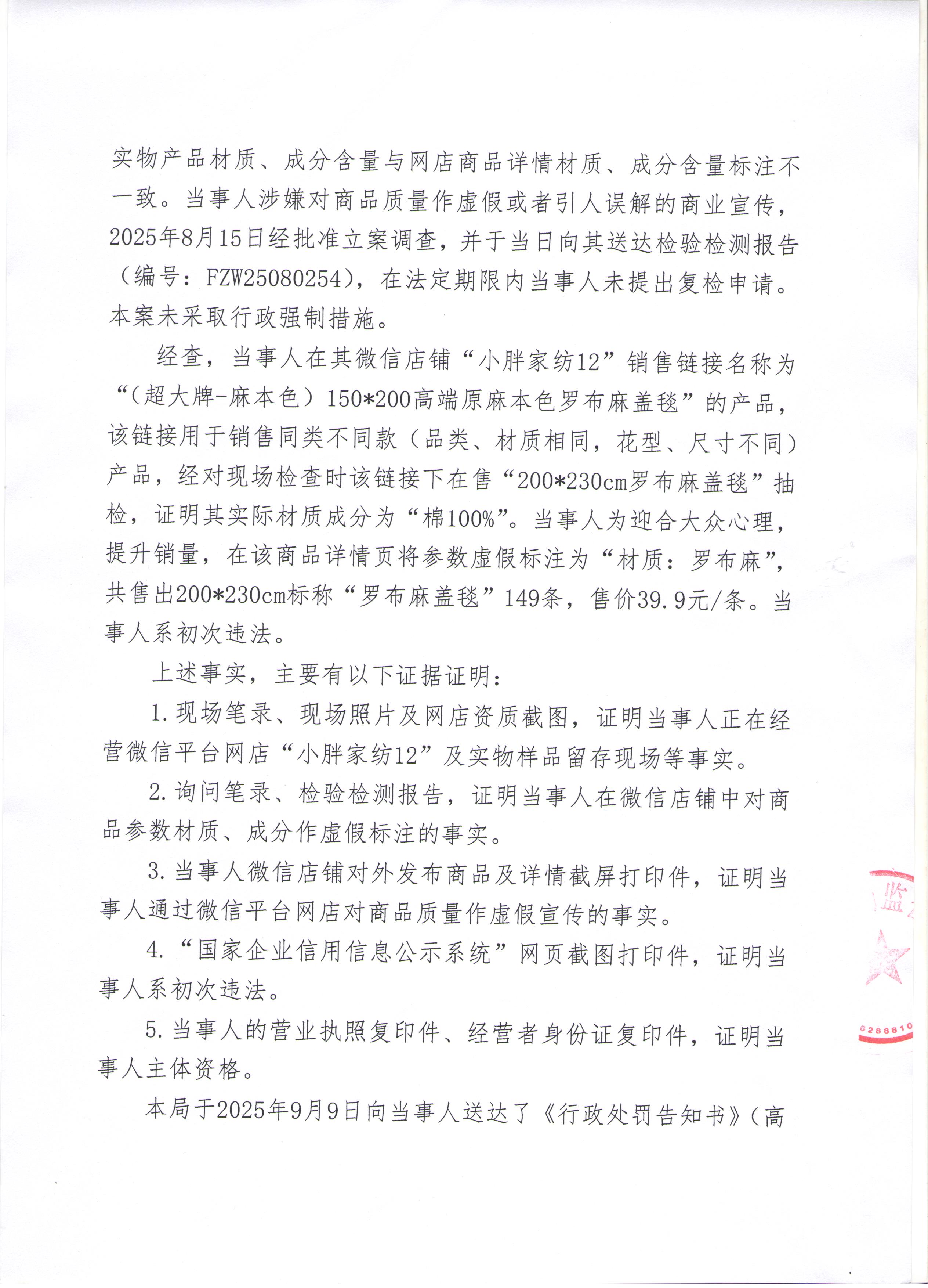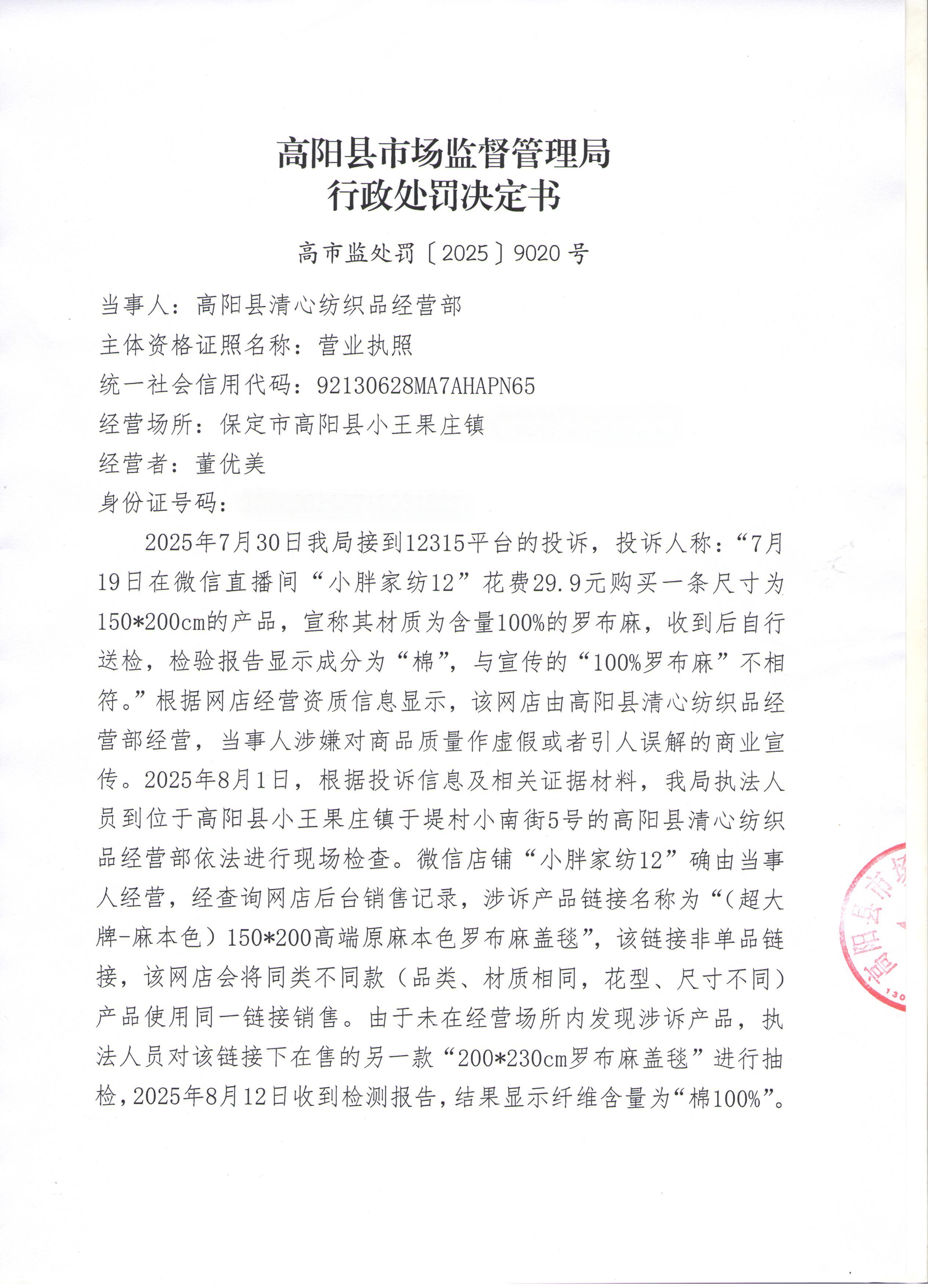 高阳县清心纺织品经营部对商品质量作虚假或者引人误解的商业宣传案