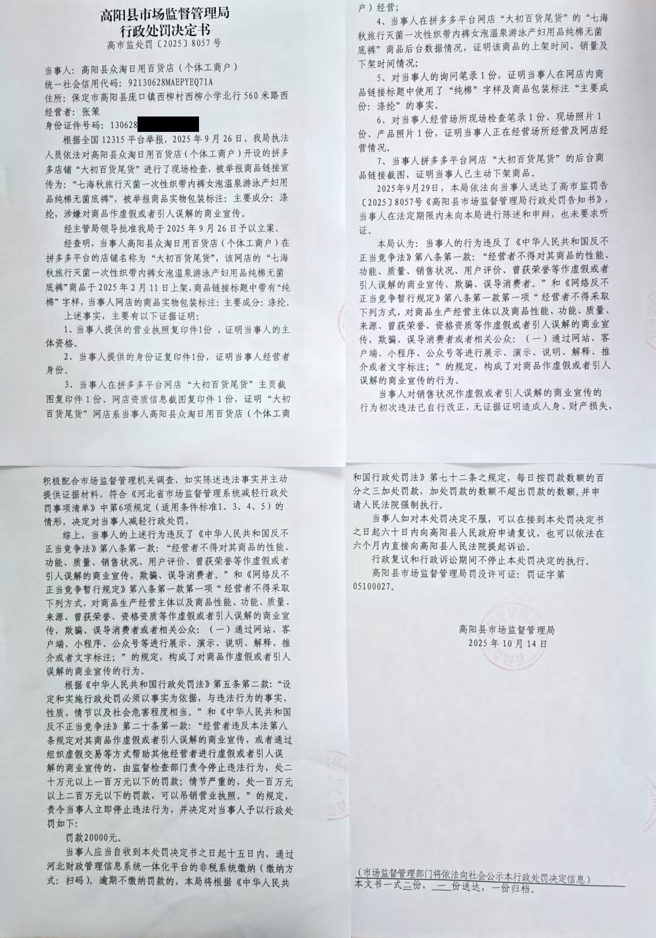 高阳县众淘日用百货店(个体工商户)对商品作虚假或者引人误解的商业宣传案
