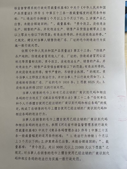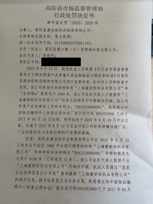 高阳县漫洁纺织品制造有限公司销售伪造厂名、厂址的毛巾和在售的毛巾上擅自使用已经注销的厂商识别代码和相应条码案