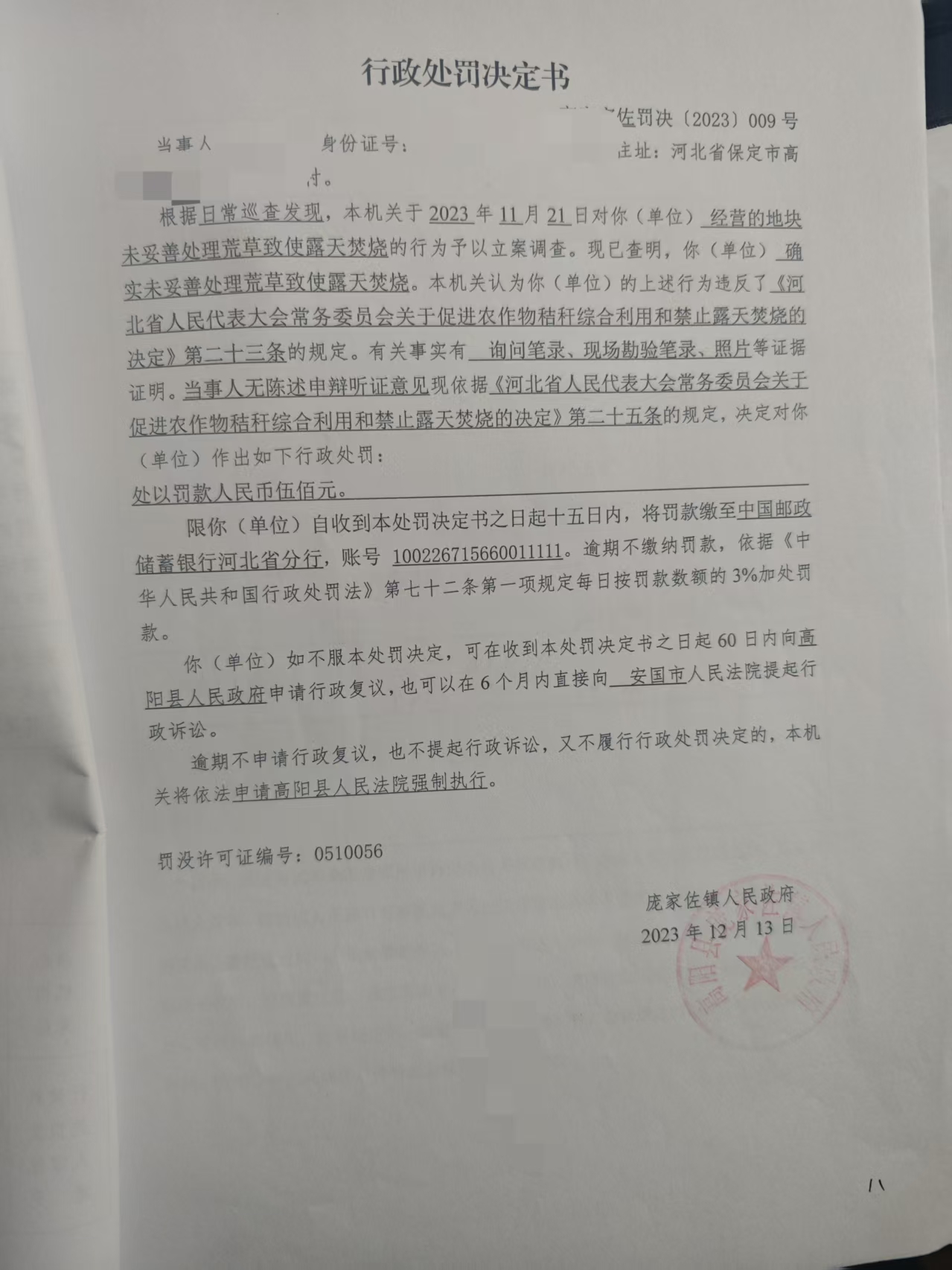 高庞家佐罚决{2023}009号