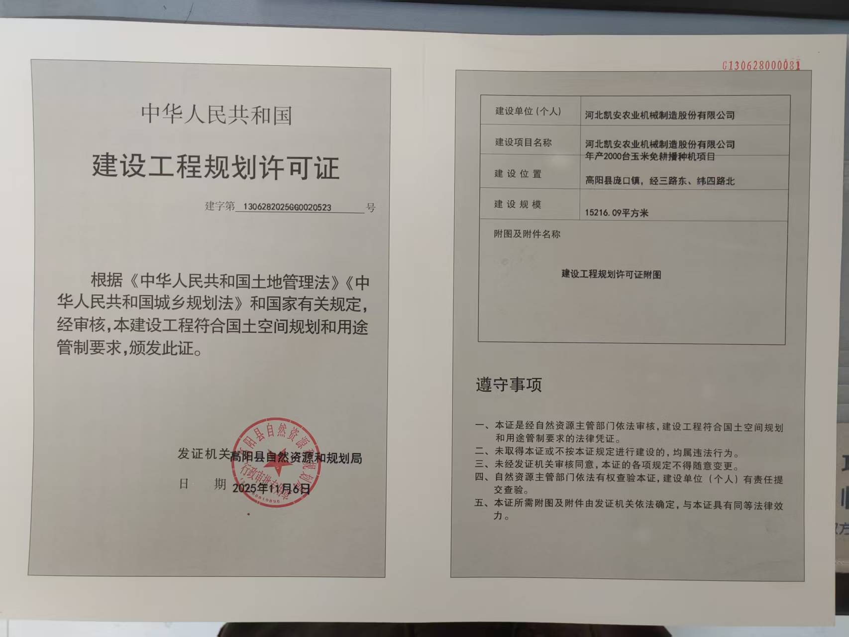 河北凯安农业机械制造股份有限公司年产2000台玉米免耕播种机项目建设工程规划许可证