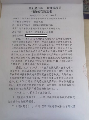 河北盛仁医药销售连锁有限公司高阳县南马店未建立并执行医疗器械进货查验记录制度案