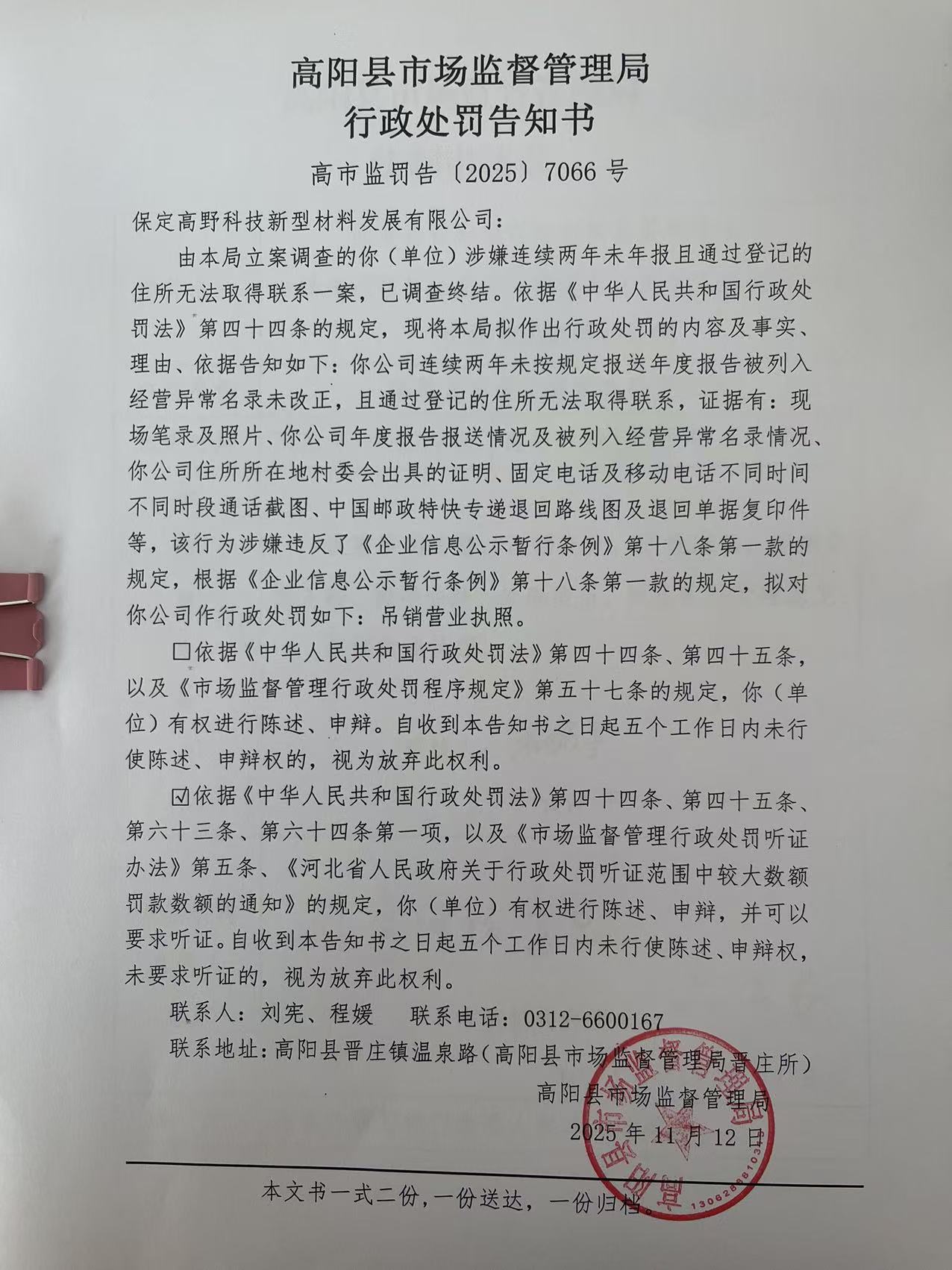高阳县市场监督管理局行政处罚告知书送达公告