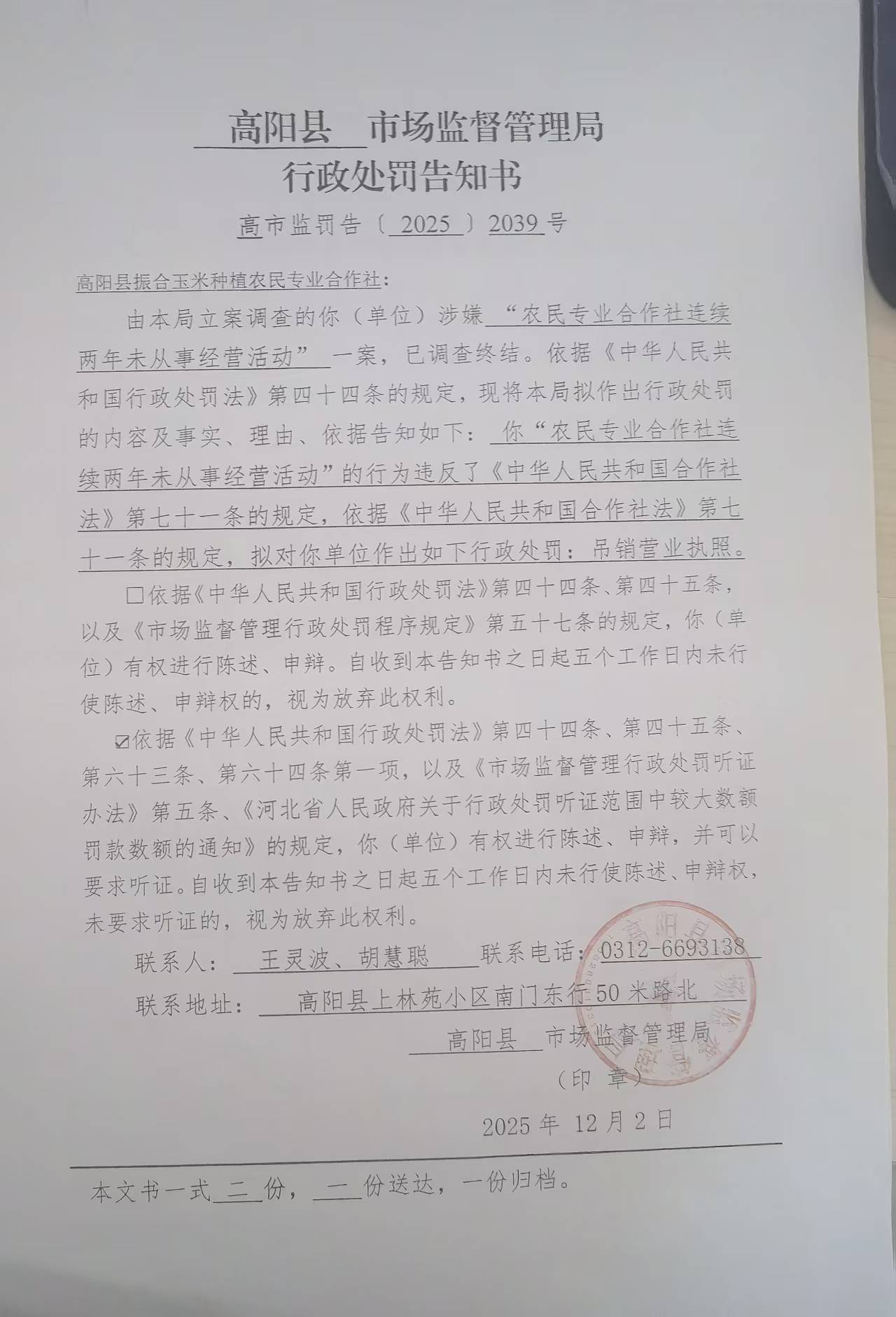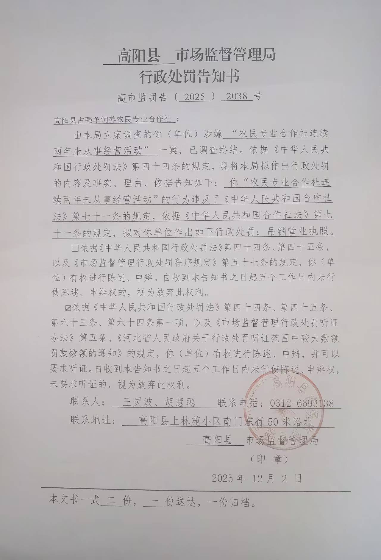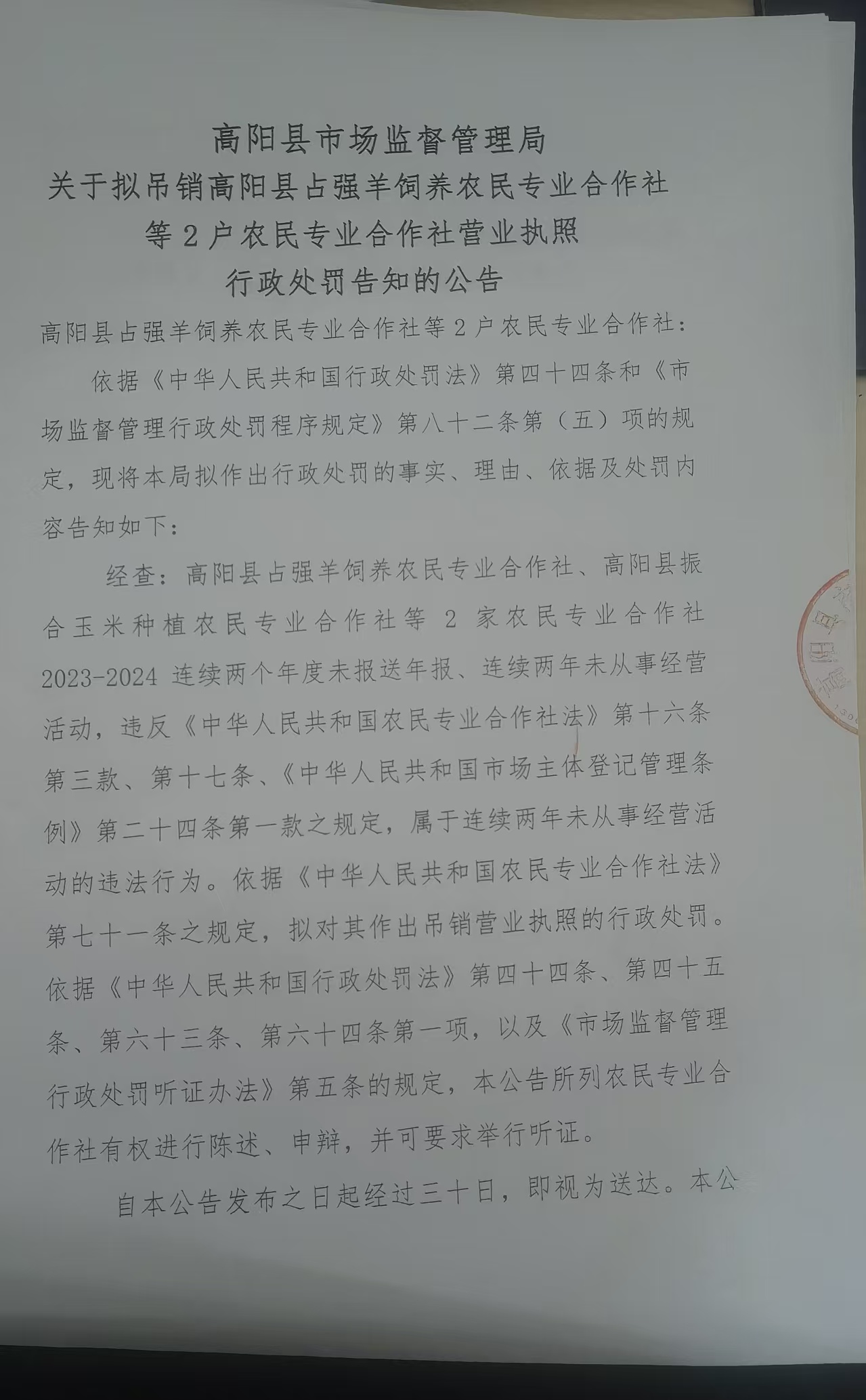 关于拟吊销高阳县占强羊饲养农民专业合作社等2户农民专业合作社营业执照行政处罚告知的公告