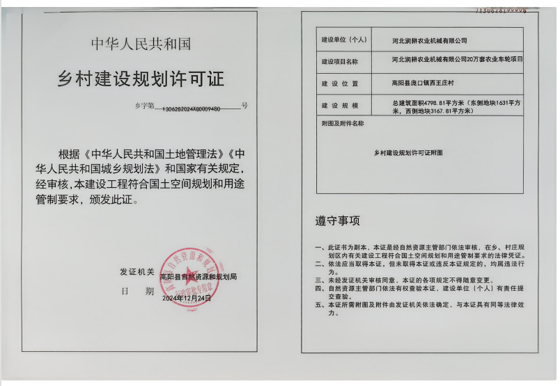 河北润耕农业机械有限公司20万套农业车轮项目申办乡村建设规划许可延期2026年12月24日