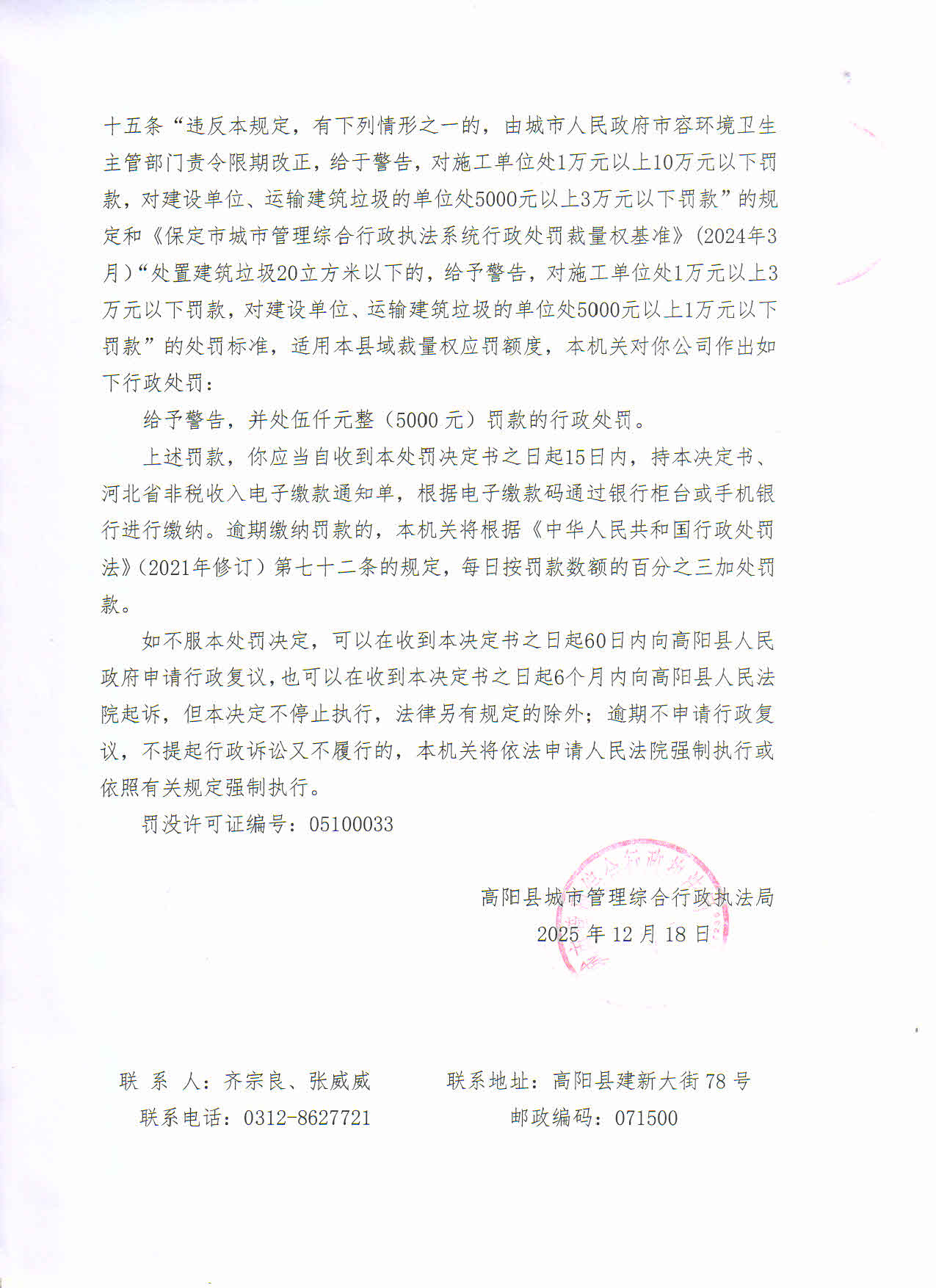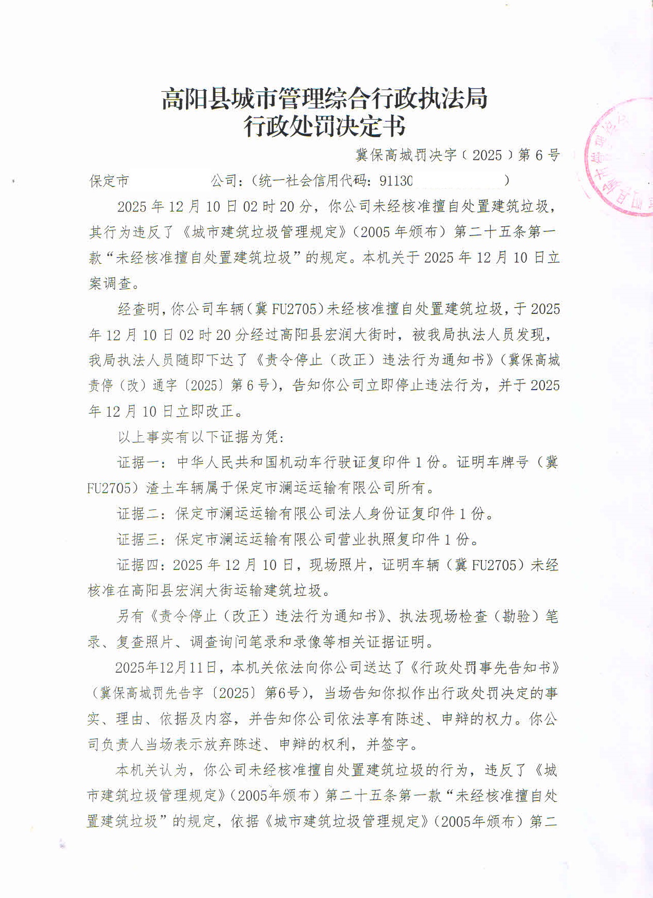 冀保高城罚决字〔2025〕第6号