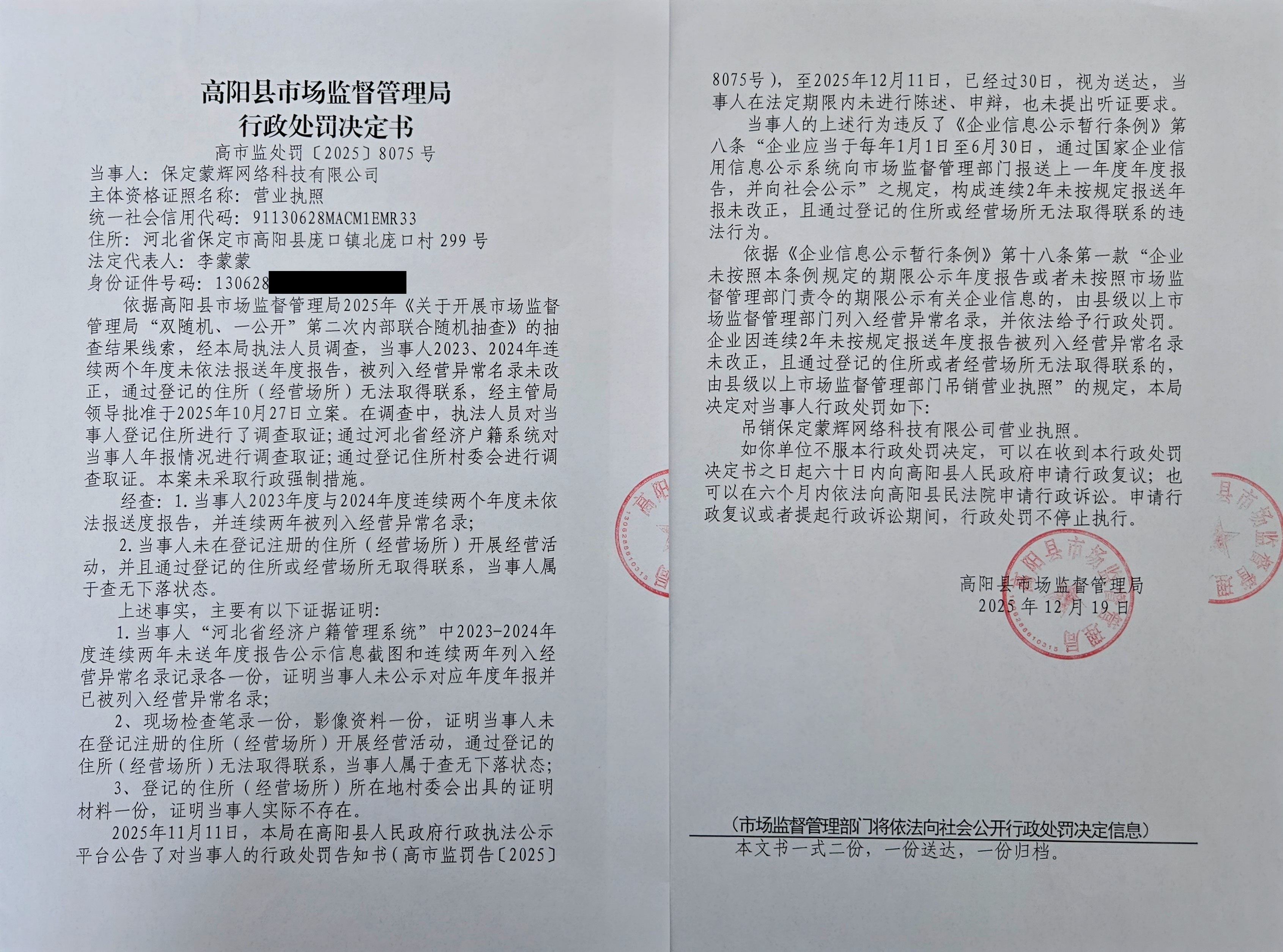 保定蒙辉网络科技有限公司连续两个年度未依法报送年度报告且通过登记的住所或经营场所无法取得联系案