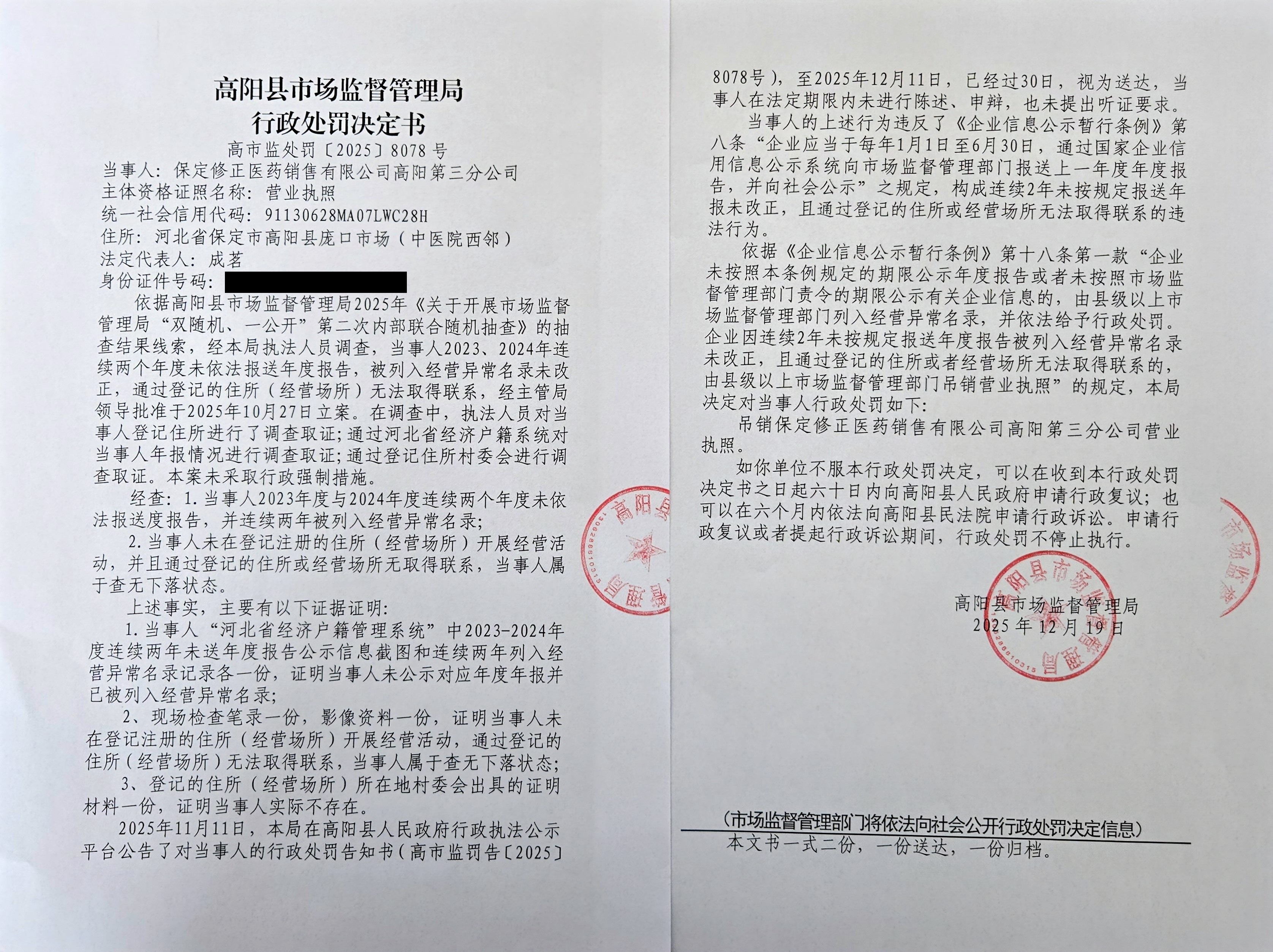 保定修正医药销售有限公司高阳第三分公司连续两个年度未依法报送年度报告且通过登记的住所或经营场所无法取得联系案
