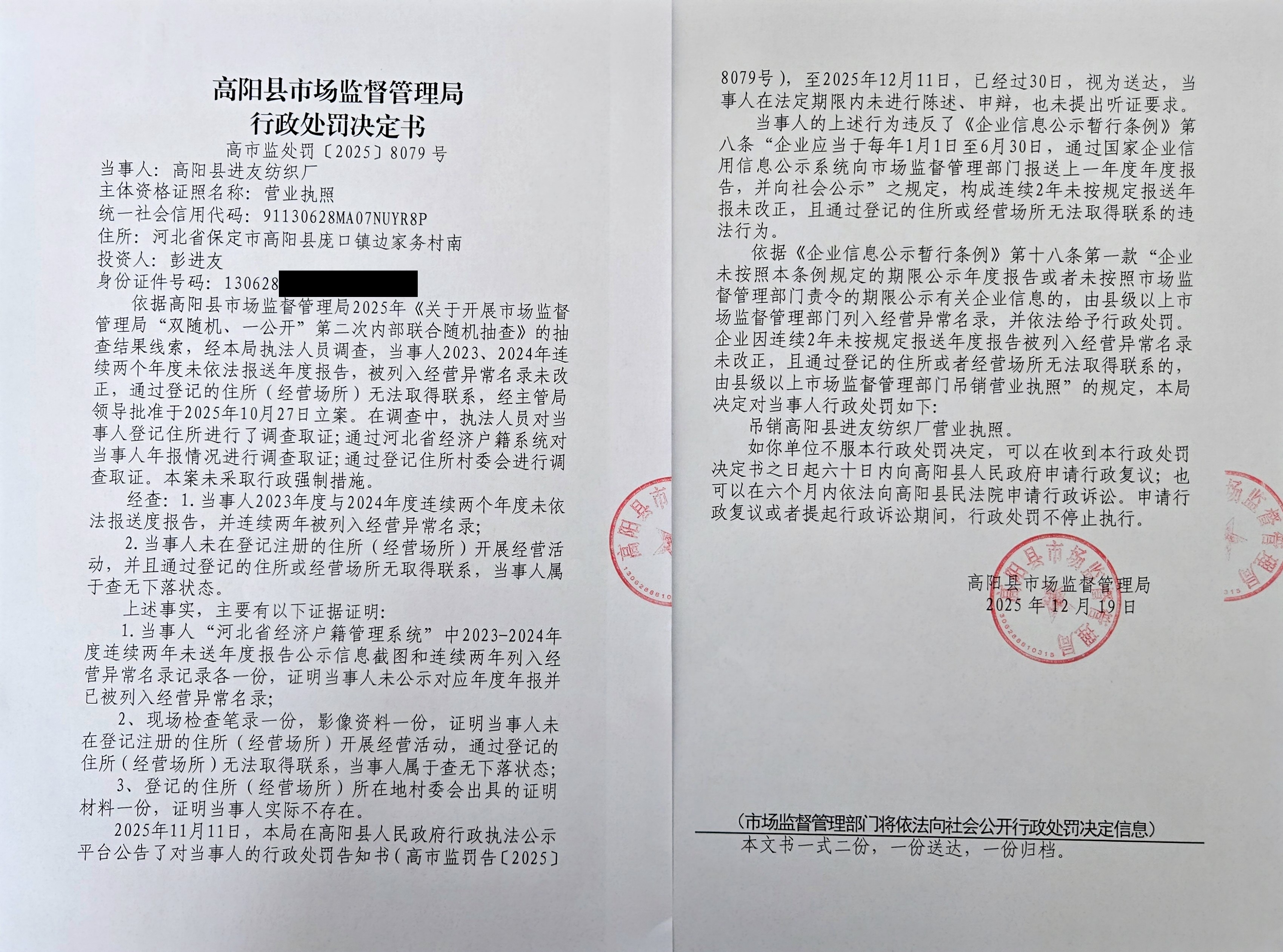 高阳县进友纺织厂连续两个年度未依法报送年度报告且通过登记的住所或经营场所无法取得联系案