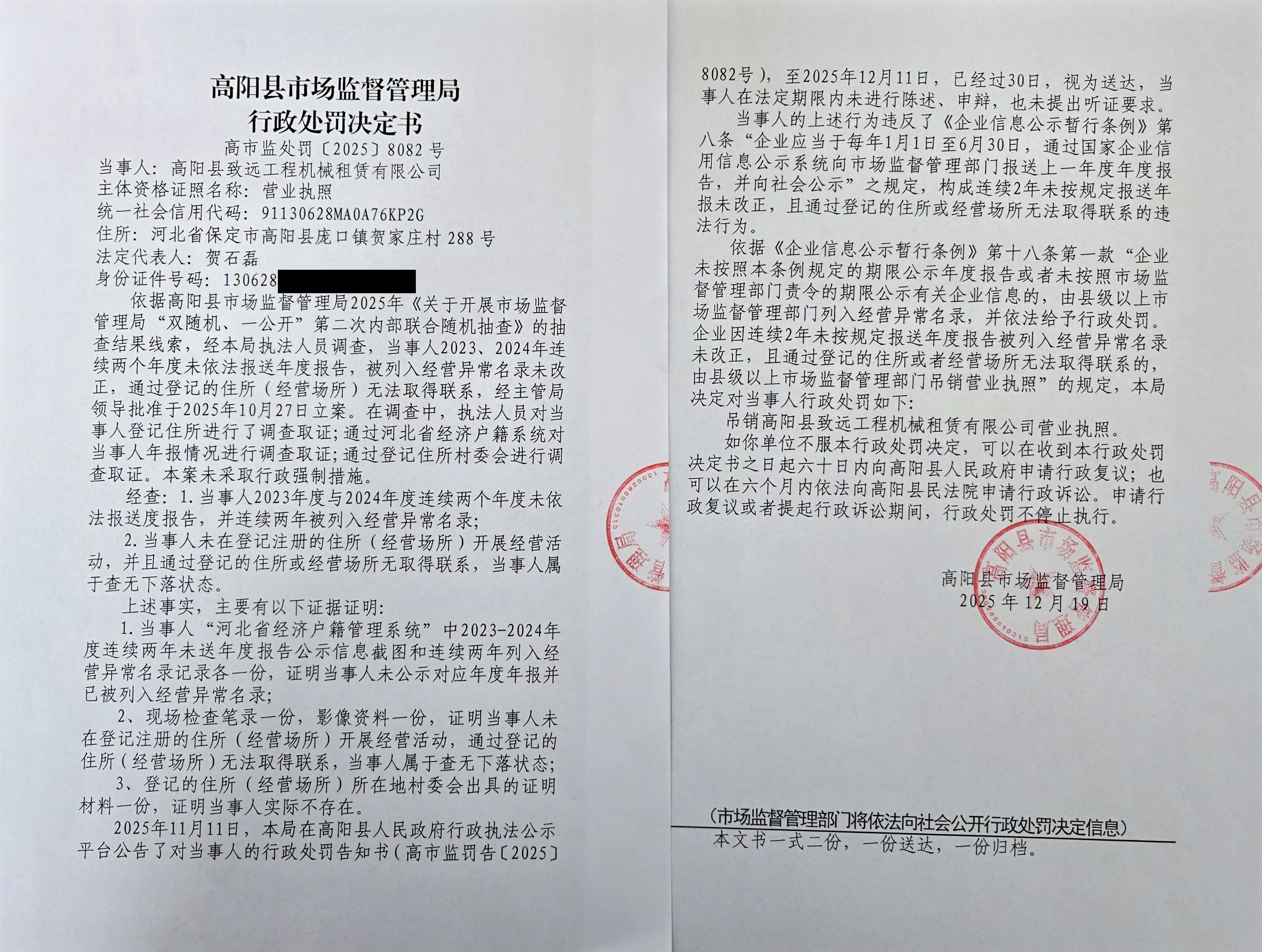 高阳县致远工程机械租赁有限公司连续两个年度未依法报送年度报告且通过登记的住所或经营场所无法取得联系案