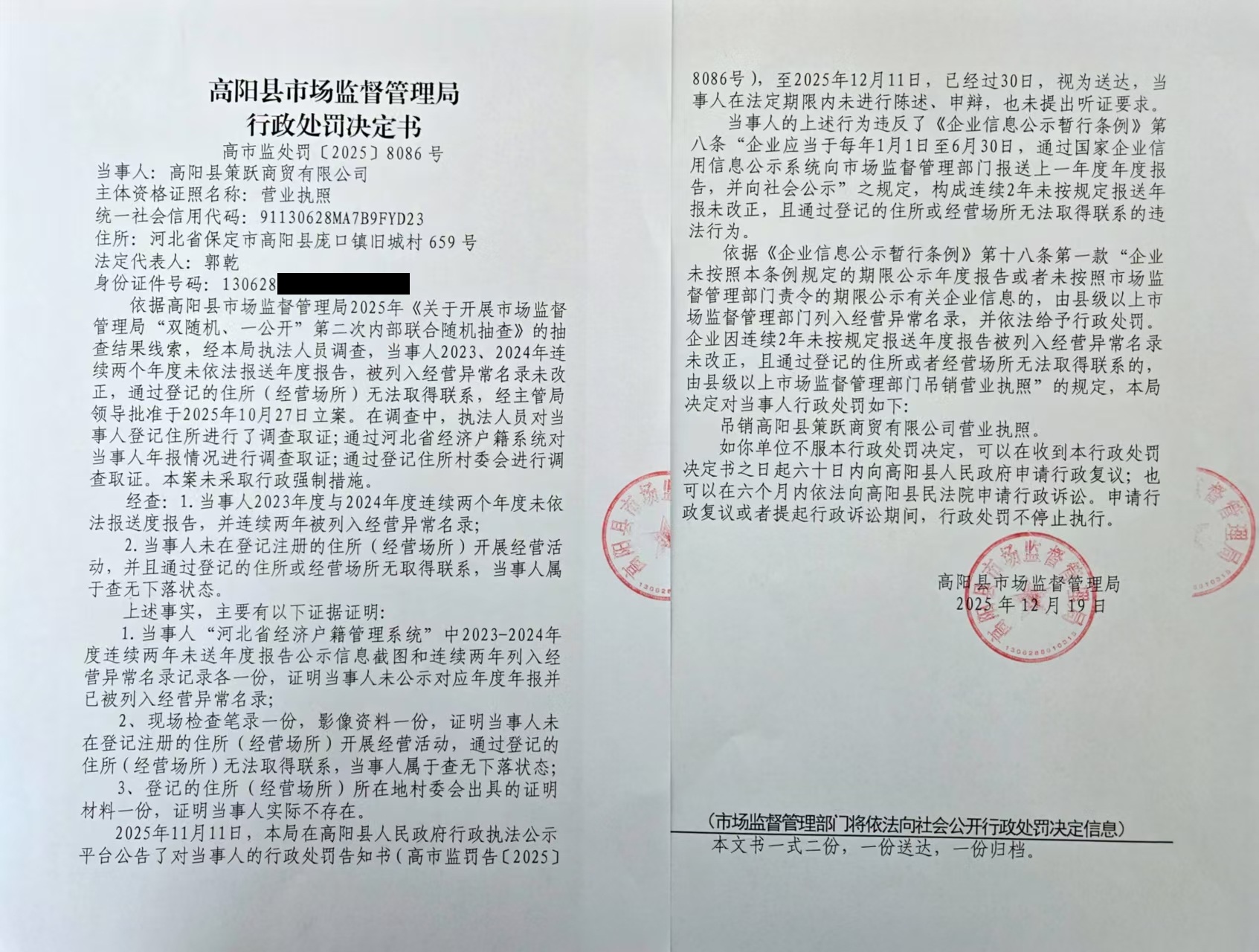 高阳县策跃商贸有限公司连续两个年度未依法报送年度报告且通过登记的住所或经营场所无法取得联系案