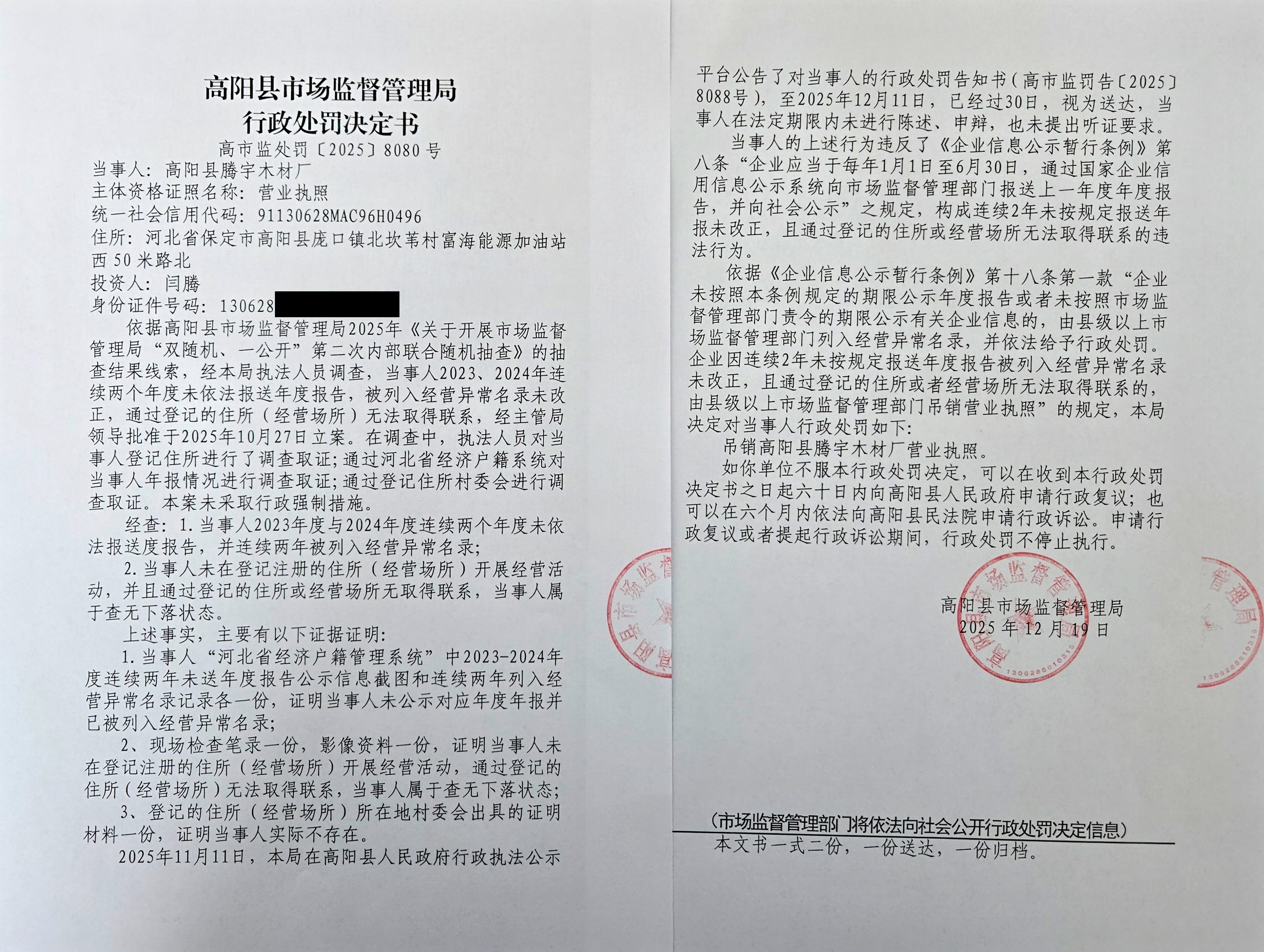 高阳县腾宇木材厂连续两个年度未依法报送年度报告且通过登记的住所或经营场所无法取得联系案