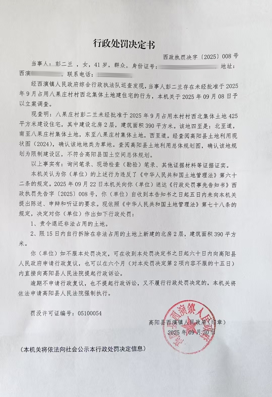 《行政处罚决定书》西政执罚决字〔2025〕008号