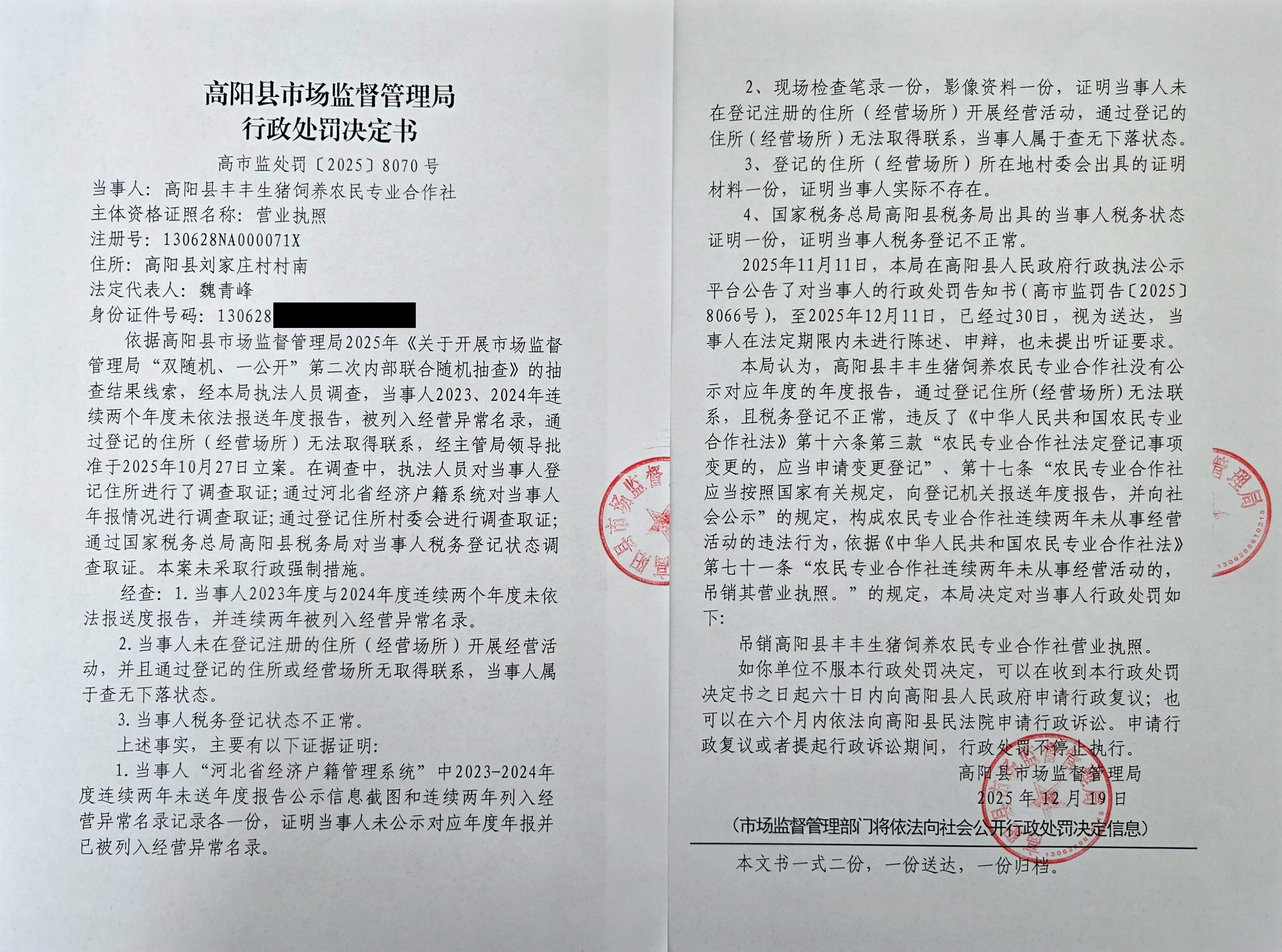 关于吊销高阳县丰丰生猪饲养农民专业合作社等5户农民专业合作社营业执照 行政处罚决定的公告