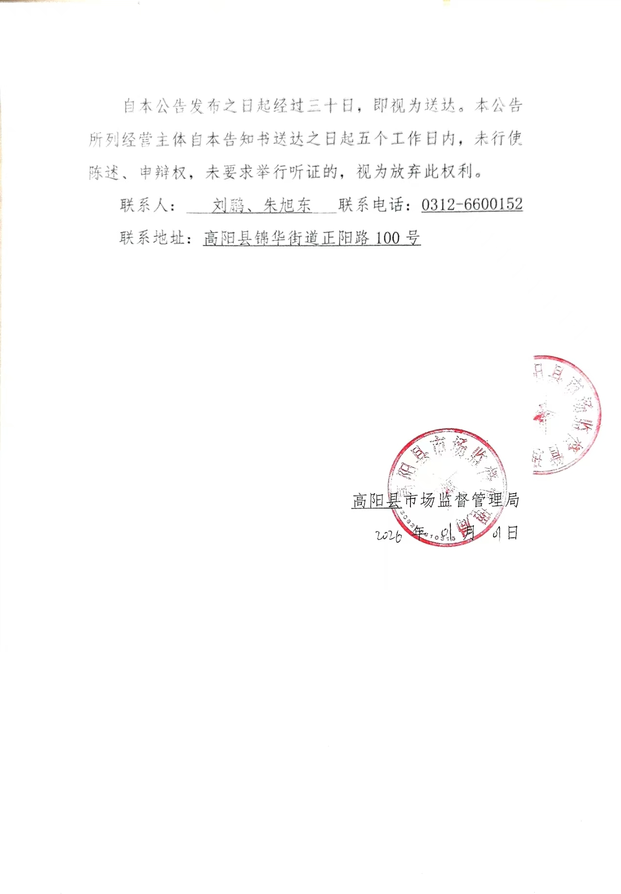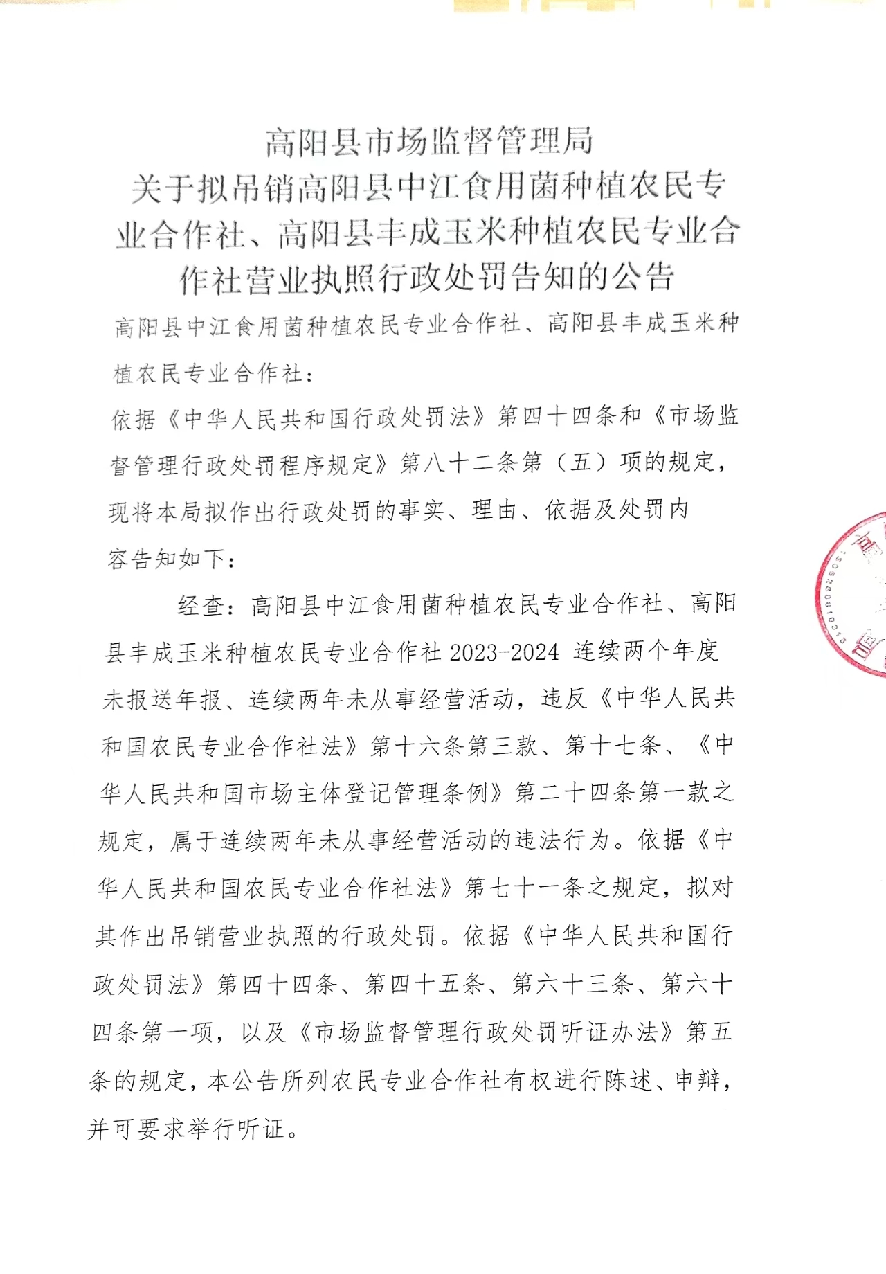 高阳县市场监督管理局关于拟吊销高阳县中江食用菌种植农民专业合作社、高阳县丰成玉米种植农民专业合作社营业执照行政处罚告知的公告