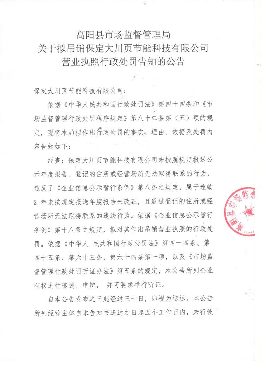 高阳县市场监督管理局关于拟吊销保定大川页节能科技有限公司营业执照行政处罚告知的公告