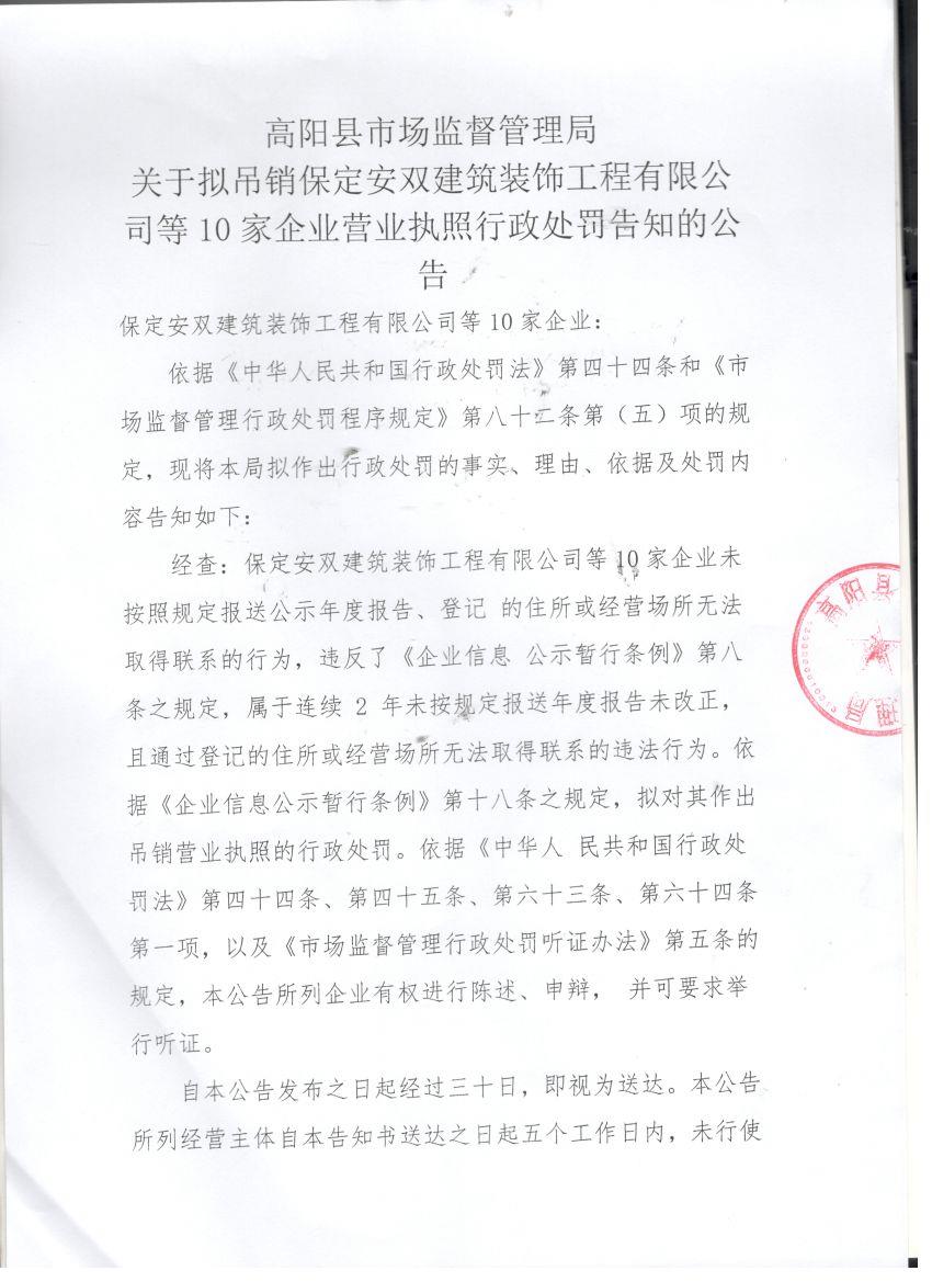 关于拟吊销保定安双建筑装饰工程有限公司等10家企业营业执照行政处罚告知的公告
