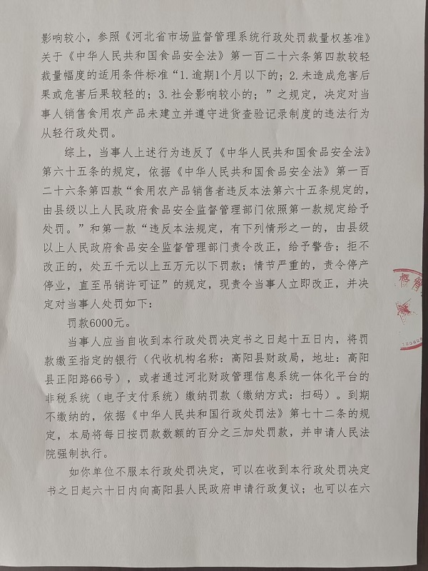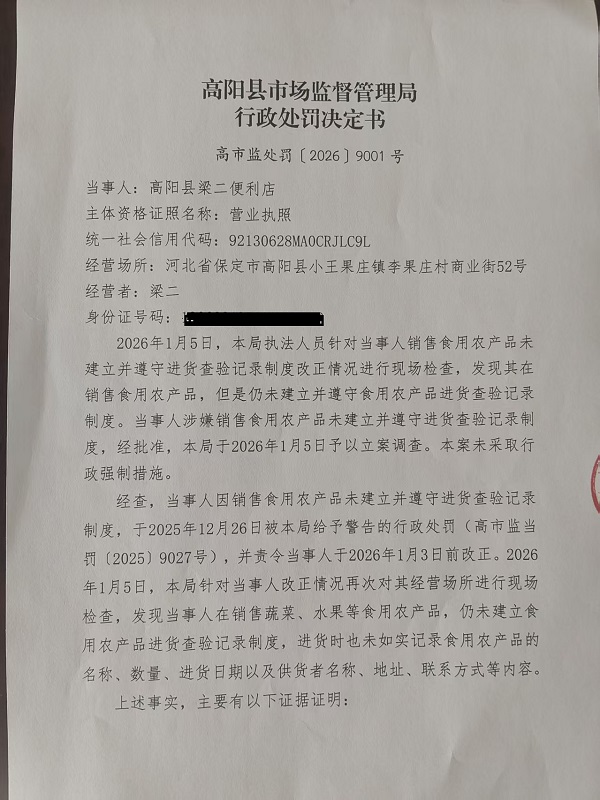 高阳县梁二便利店销售食用农产品未建立并遵守进货查验记录制度案