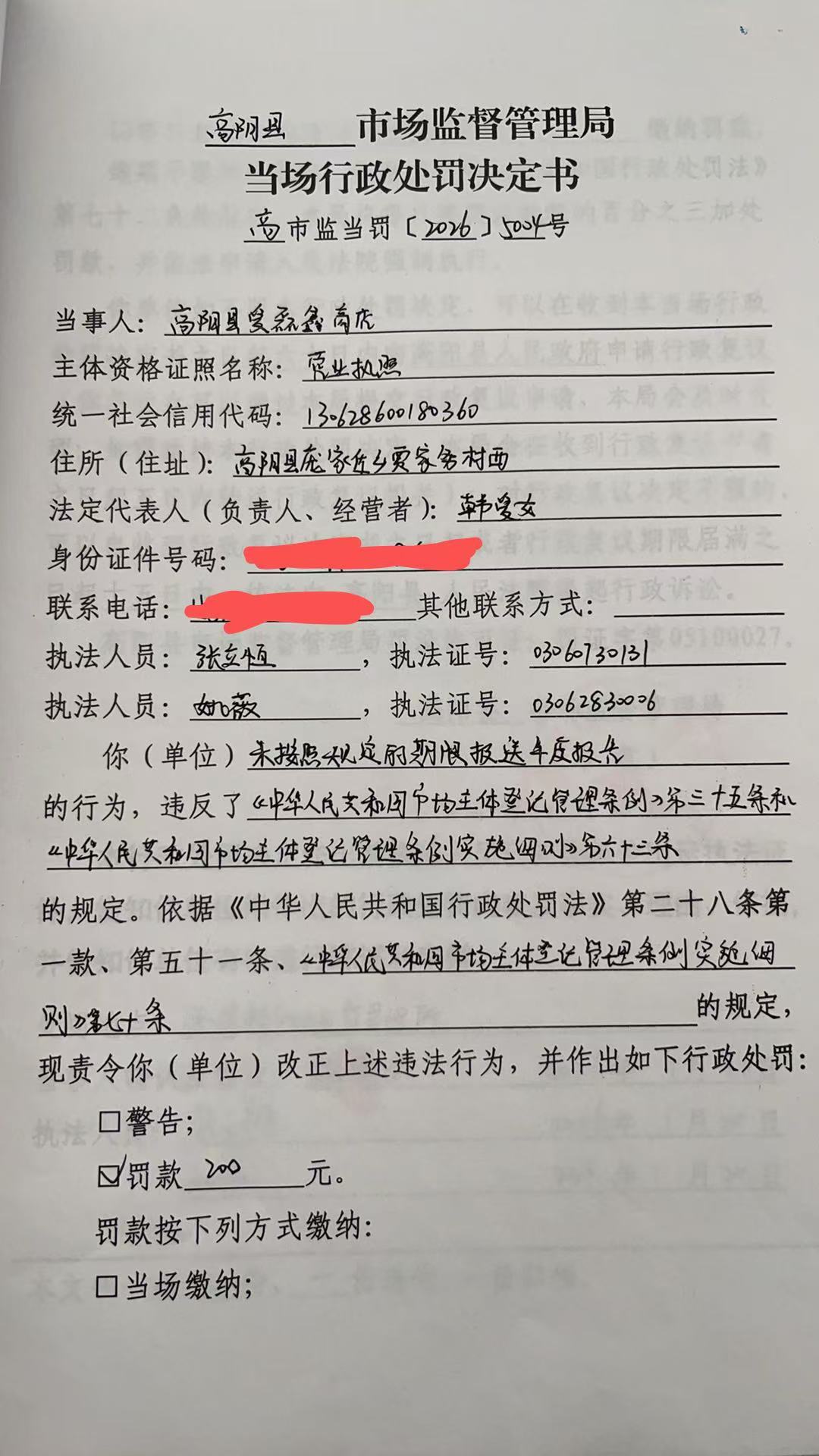 高阳县爱磊鑫商店未按照规定的期限报送年度报告案