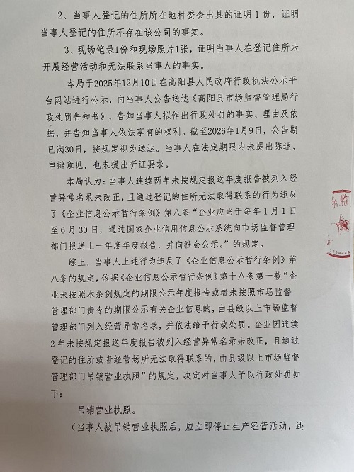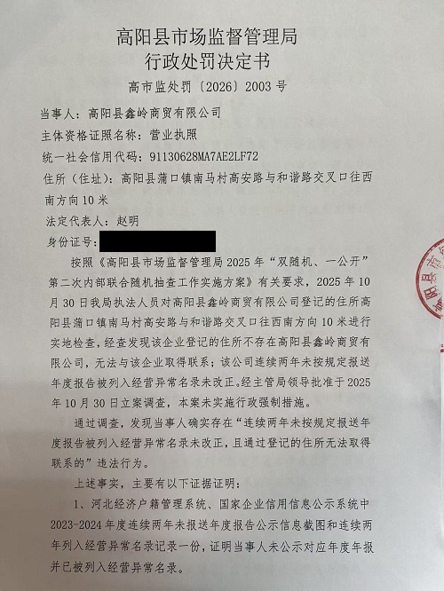 高阳县鑫岭商贸有限公司连续两年未年报且通过登记的住所无法取得联系案