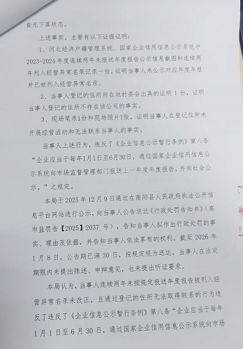 高阳县萨罗商贸有限公司连续两年未年报且通过登记的住所无法取得联系案