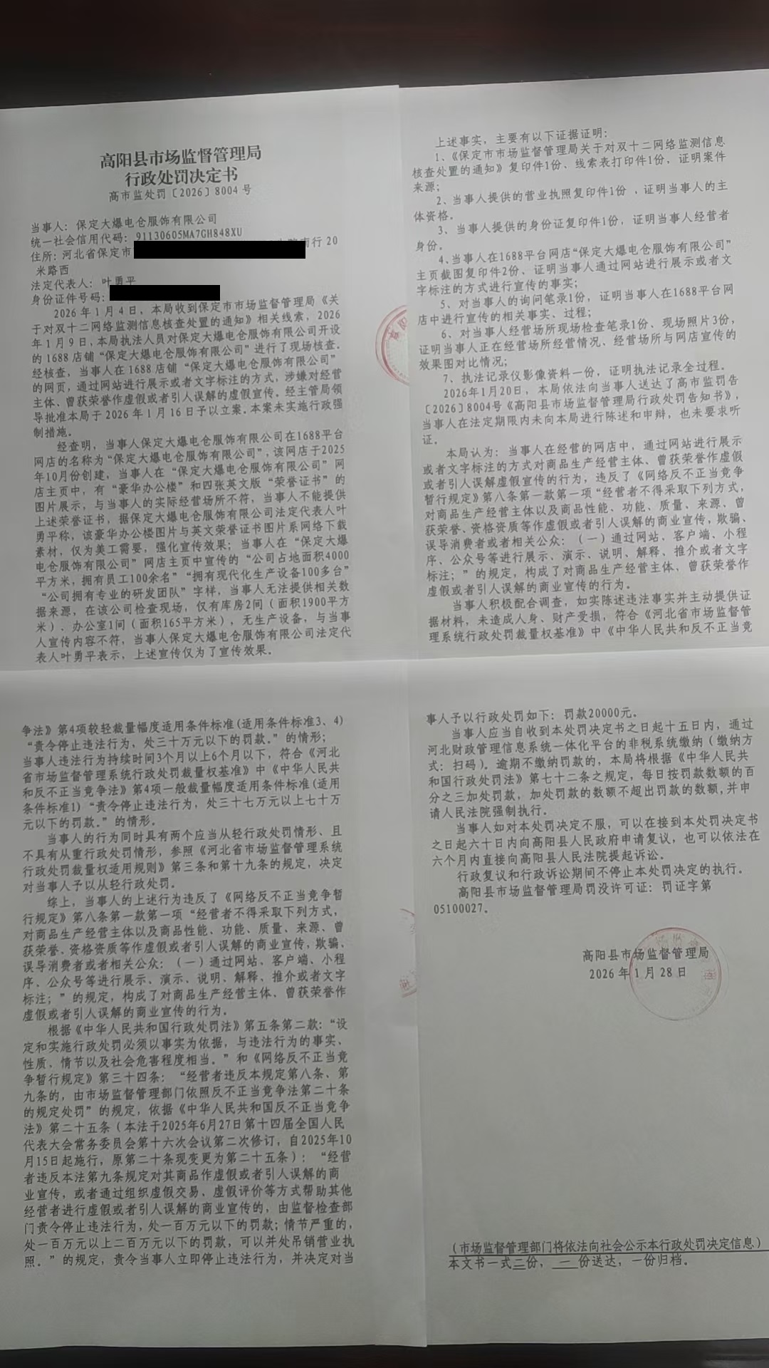保定大爆电仓服饰有限公司对商品生产经营主体、曾获荣誉作虚假或者引人误解的商业宣传案