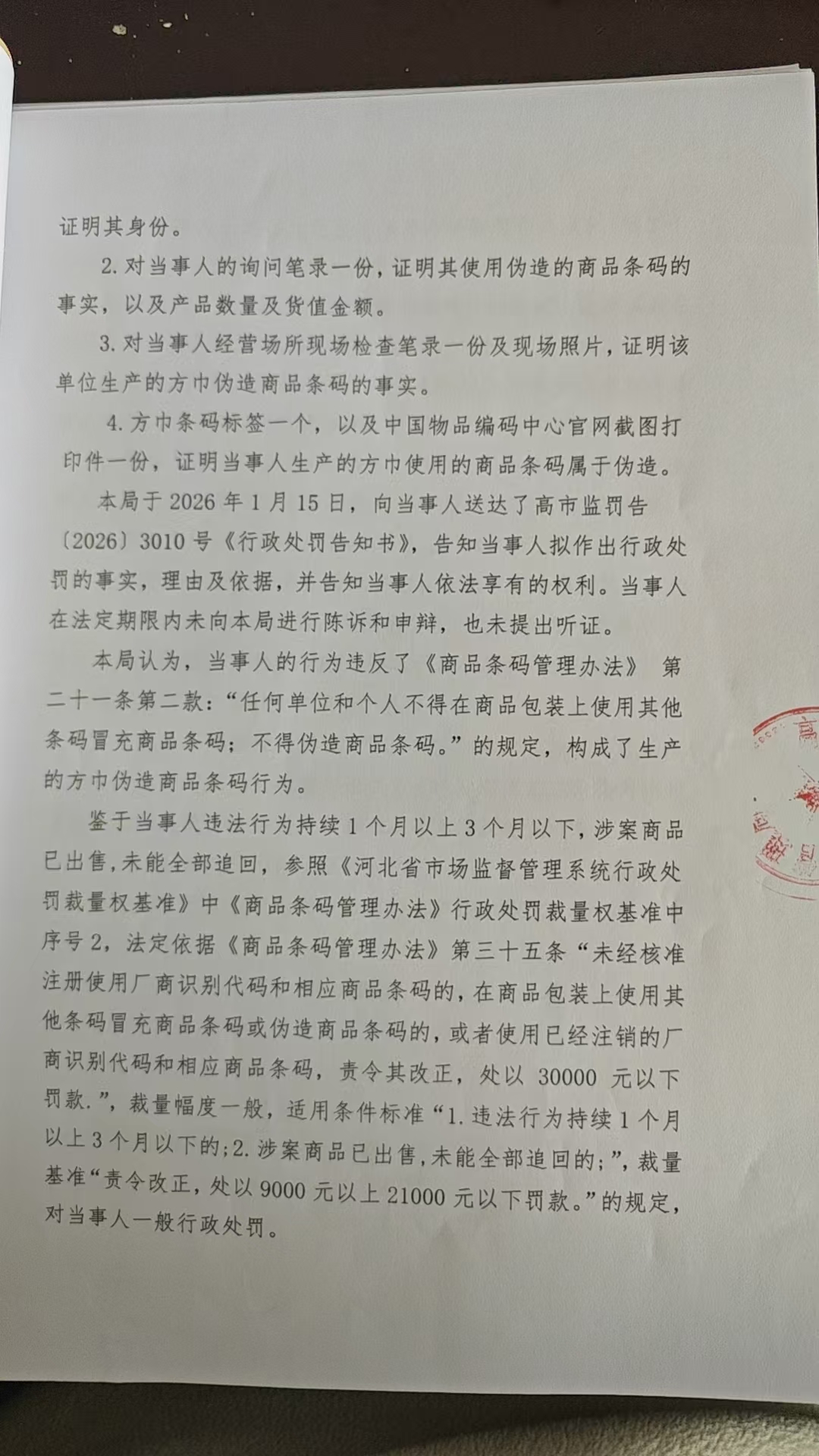高阳县文权织物厂生产的方巾伪造商品条码案