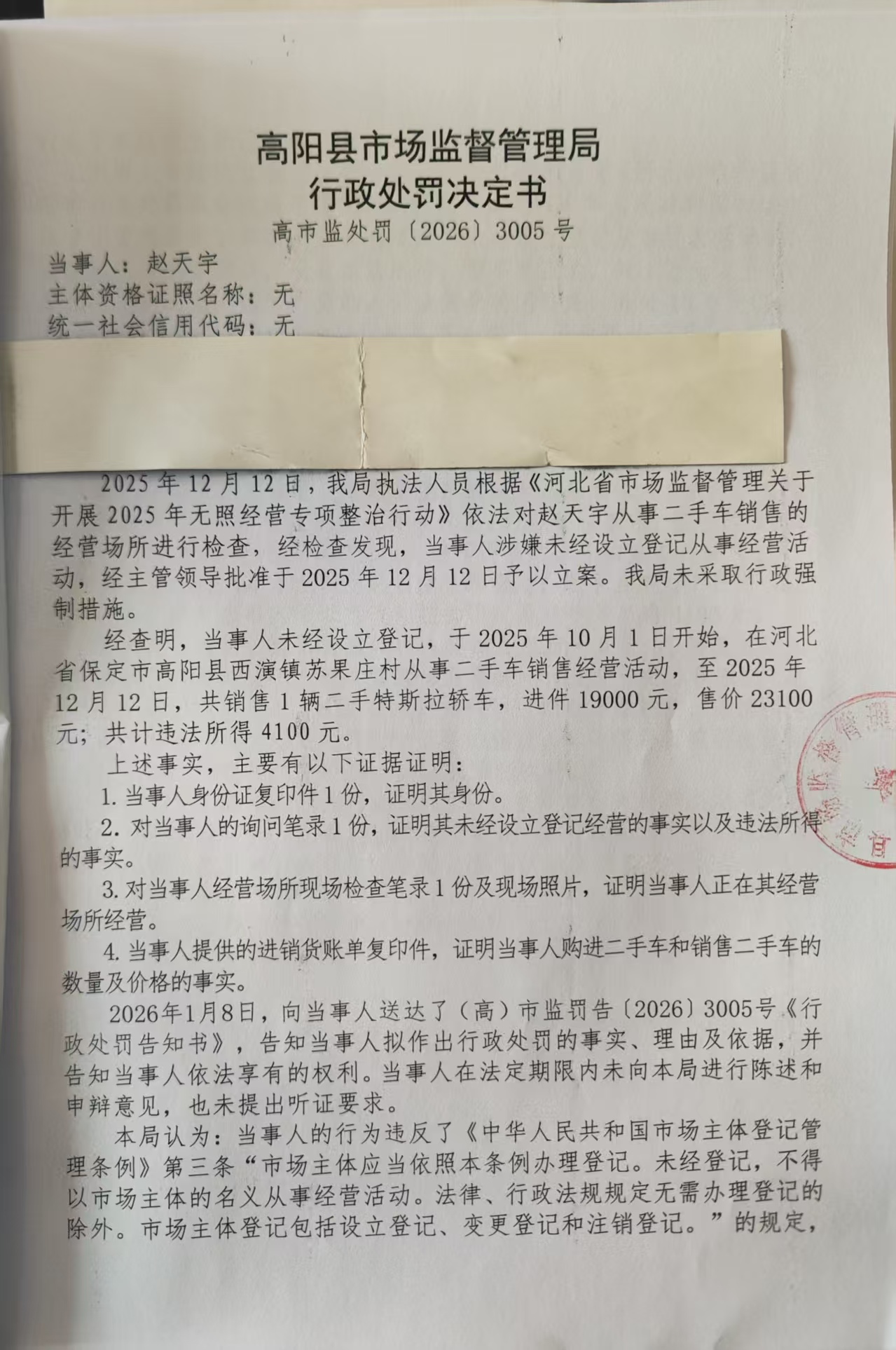 赵天宇未设立登记从事二手车买卖经营活动